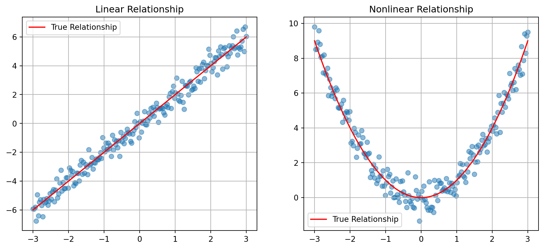 y_nonlinear = x**2 + np.random.normal(0, 0.5, n_points)