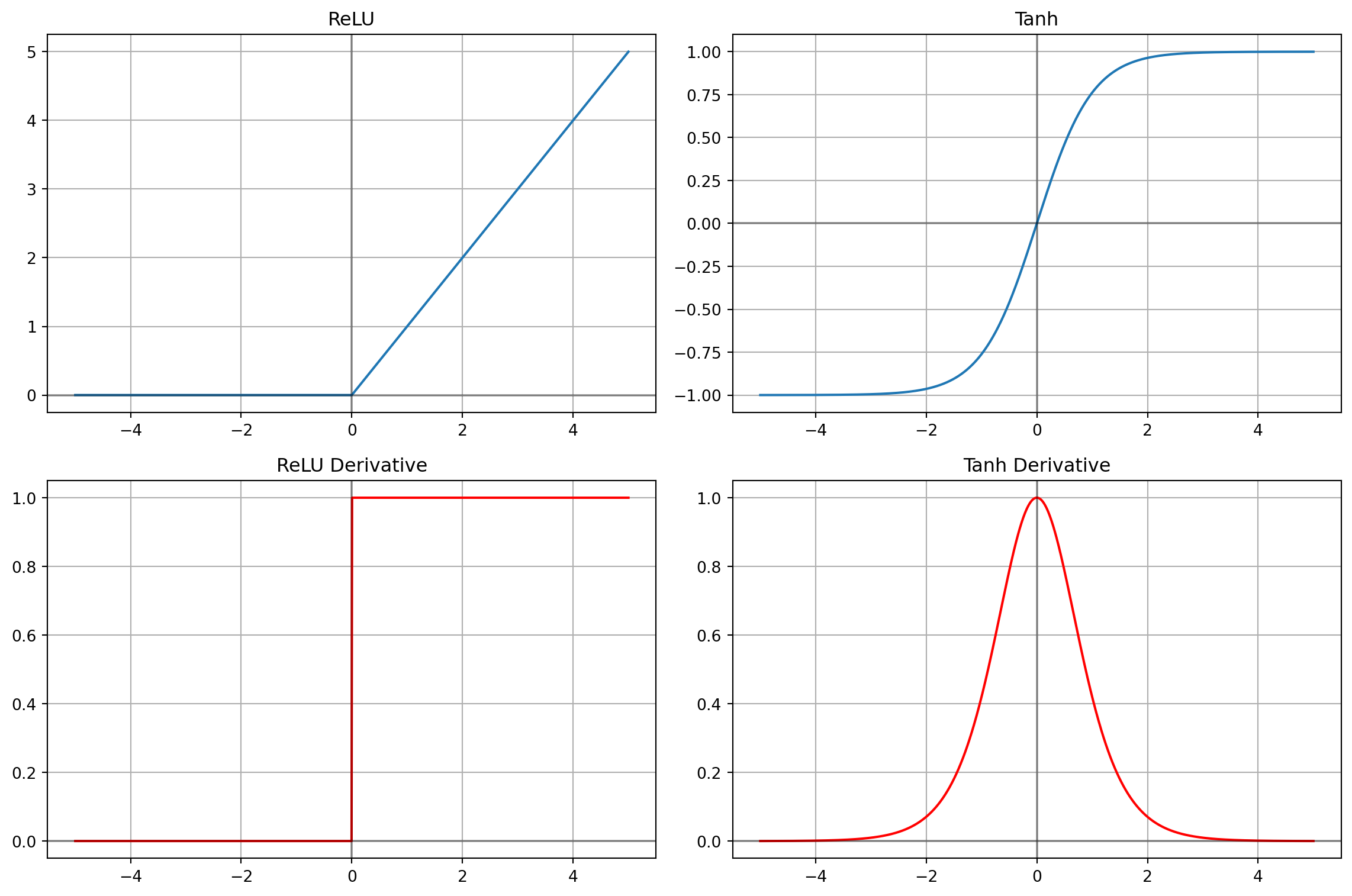 For ReLU, the derivative is either 0 (for negative inputs) or 1 (for positive inputs). This binary nature can lead to better gradient flow for positive activations but can cause “dying ReLU” problems when too many neurons have negative inputs.