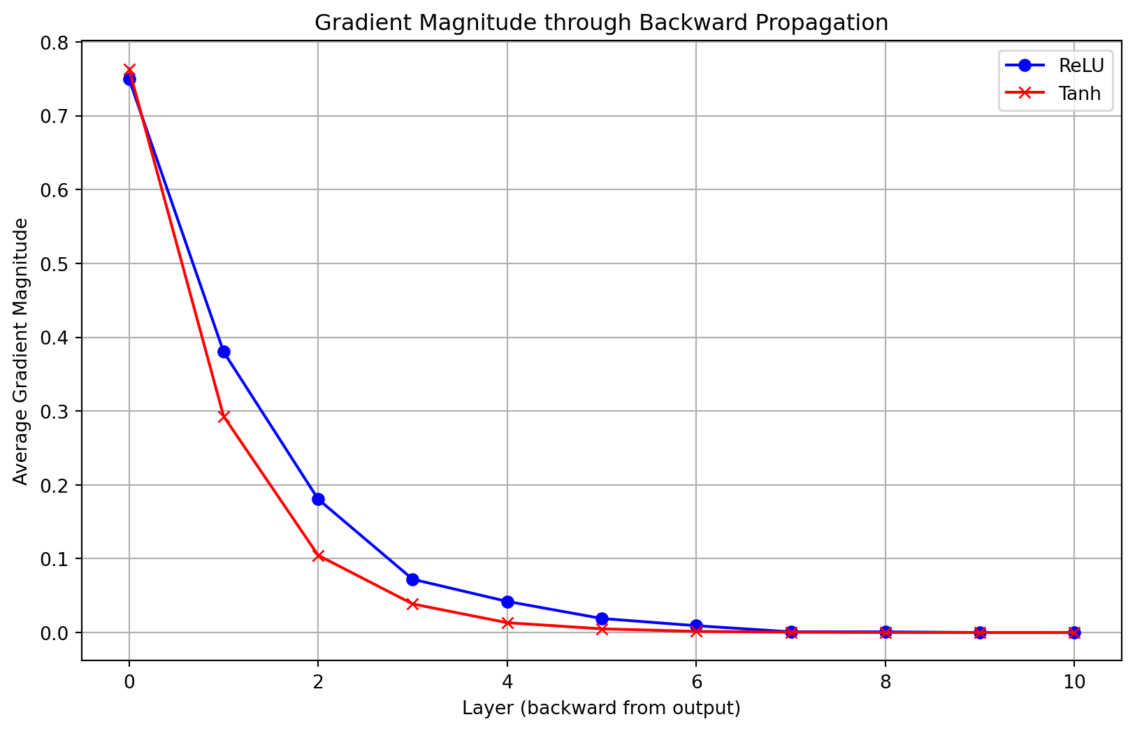 import numpy as npimport matplotlib.pyplot as pltdef demonstrate_gradient_propagation():"""Demonstrate how gradients propagate through layers with different activations""" depth =10# Number of layers n_samples =1000# Generate random initial gradients np.random.seed(42) initial_gradients = np.random.normal(0, 1, (n_samples,))# Track gradients through layers relu_gradients = [initial_gradients] tanh_gradients = [initial_gradients]# Propagate through layersfor _ inrange(depth):# For ReLU: randomly zero out 50% of values (simulating negative inputs) relu_mask = np.random.binomial(1, 0.5, size=n_samples) relu_layer_grad = relu_gradients[-1] * relu_mask relu_gradients.append(relu_layer_grad)# For tanh: multiply by derivative values (simulating tanh derivative distribution)# Tanh derivatives are maximum 1 at x=0, and decrease as |x| increases x_values = np.random.normal(0, 2, size=n_samples) # Simulated pre-activations tanh_derivative =1- np.tanh(x_values)**2# Actual tanh derivative tanh_layer_grad = tanh_gradients[-1] * tanh_derivative tanh_gradients.append(tanh_layer_grad)# Calculate average gradient magnitude per layer relu_magnitudes = [np.mean(np.abs(g)) for g in relu_gradients] tanh_magnitudes = [np.mean(np.abs(g)) for g in tanh_gradients]# Add noise to simulate real training conditions layers = np.arange(depth+1) relu_magnitudes_noisy = np.array(relu_magnitudes) * (1+ np.random.normal(0, 0.05, size=len(relu_magnitudes))) tanh_magnitudes_noisy = np.array(tanh_magnitudes) * (1+ np.random.normal(0, 0.05, size=len(tanh_magnitudes))) plt.figure(figsize=(10, 6)) plt.plot(layers, relu_magnitudes_noisy, 'b-', marker='o', label='ReLU') plt.plot(layers, tanh_magnitudes_noisy, 'r-', marker='x', label='Tanh') plt.xlabel('Layer (backward from output)') plt.ylabel('Average Gradient Magnitude') plt.title('Gradient Magnitude through Backward Propagation') plt.legend() plt.grid(True) plt.show()demonstrate_gradient_propagation()