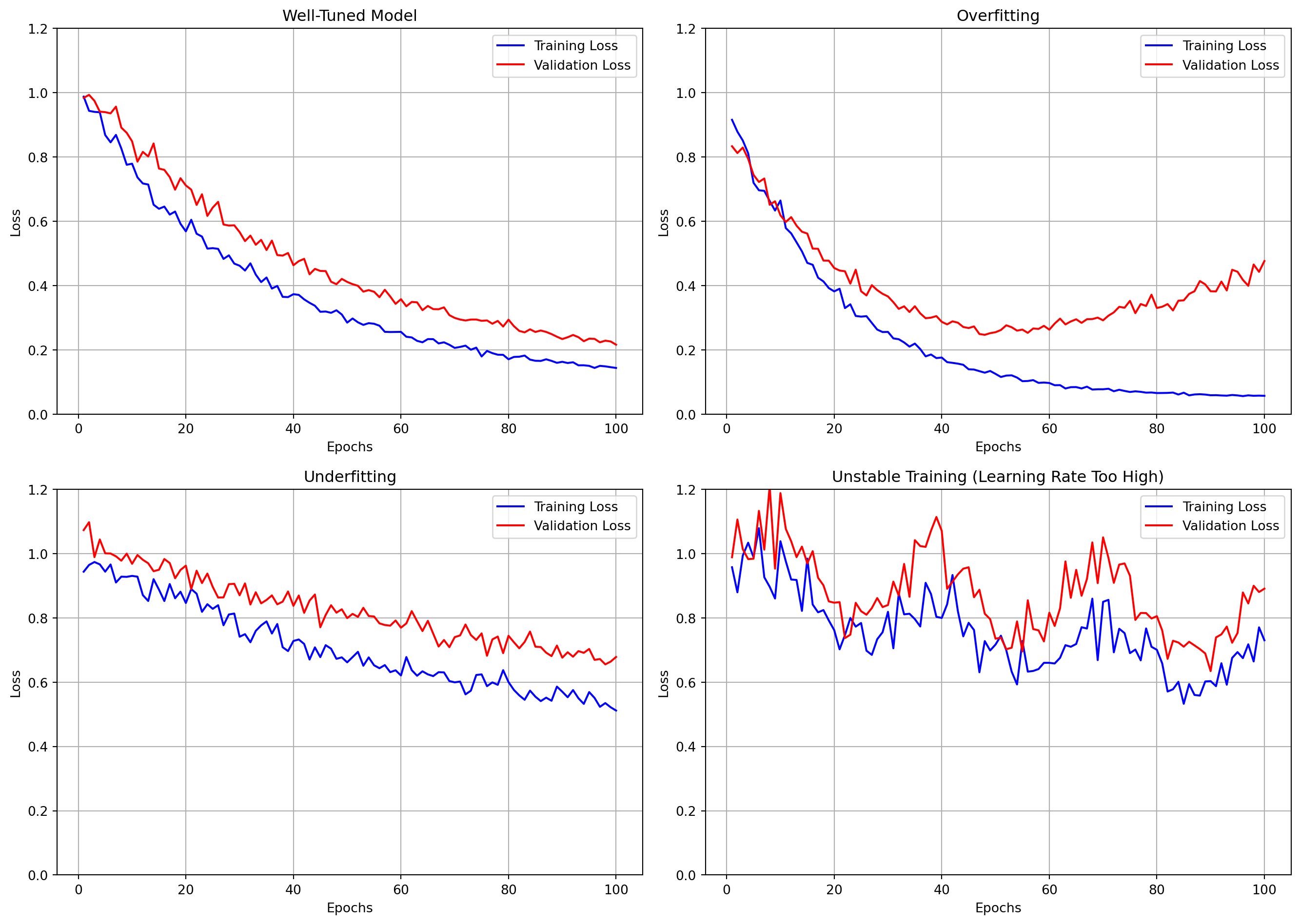 Instability: Erratic changes in metrics may indicate too high a learning rate or other issues.