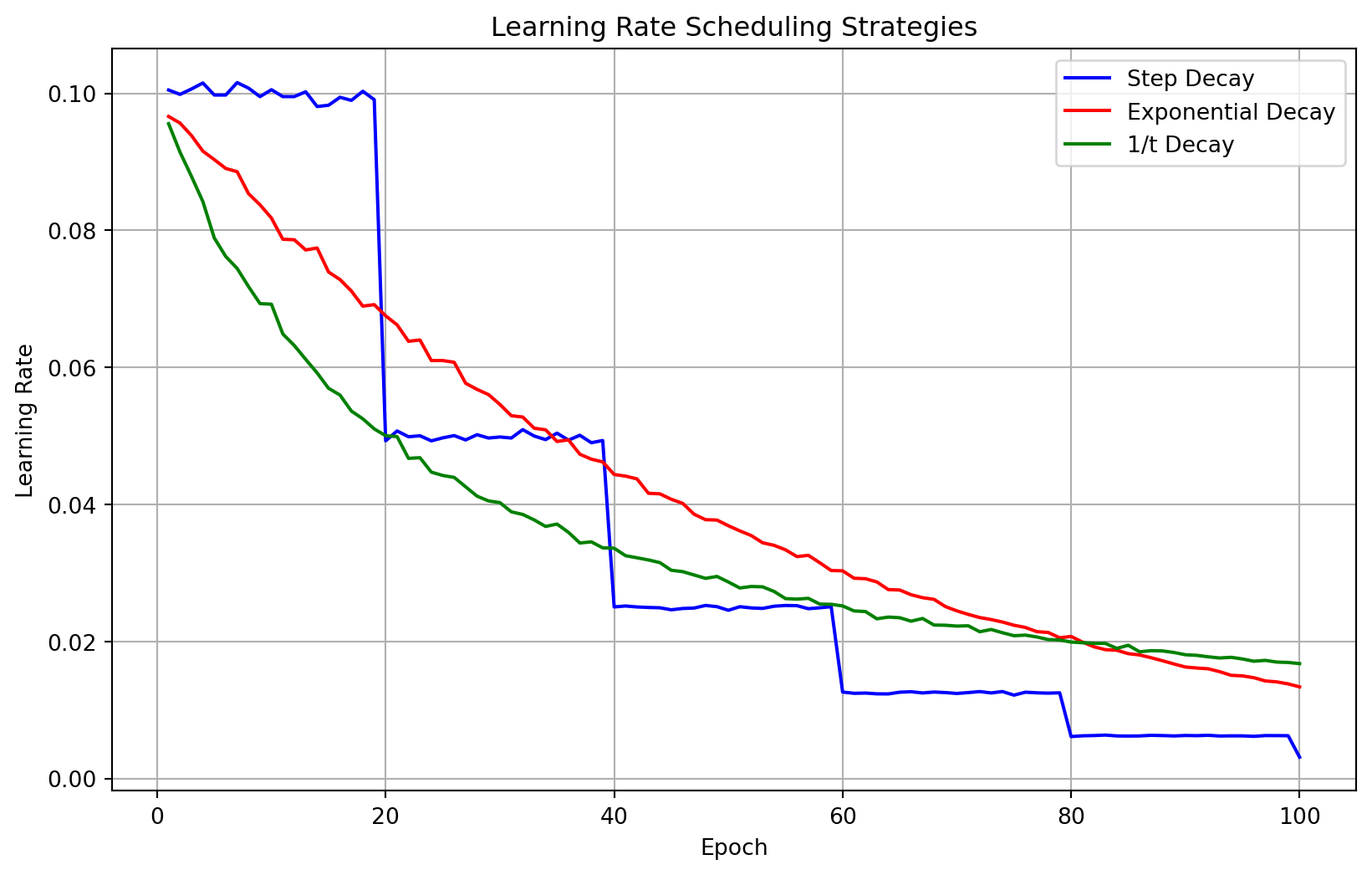 Exponential Decay: Continuously reduces the learning rate at an exponential rate. \[\eta_t = \eta_0 \cdot e^{-kt}\] where \(k\) is the decay rate.