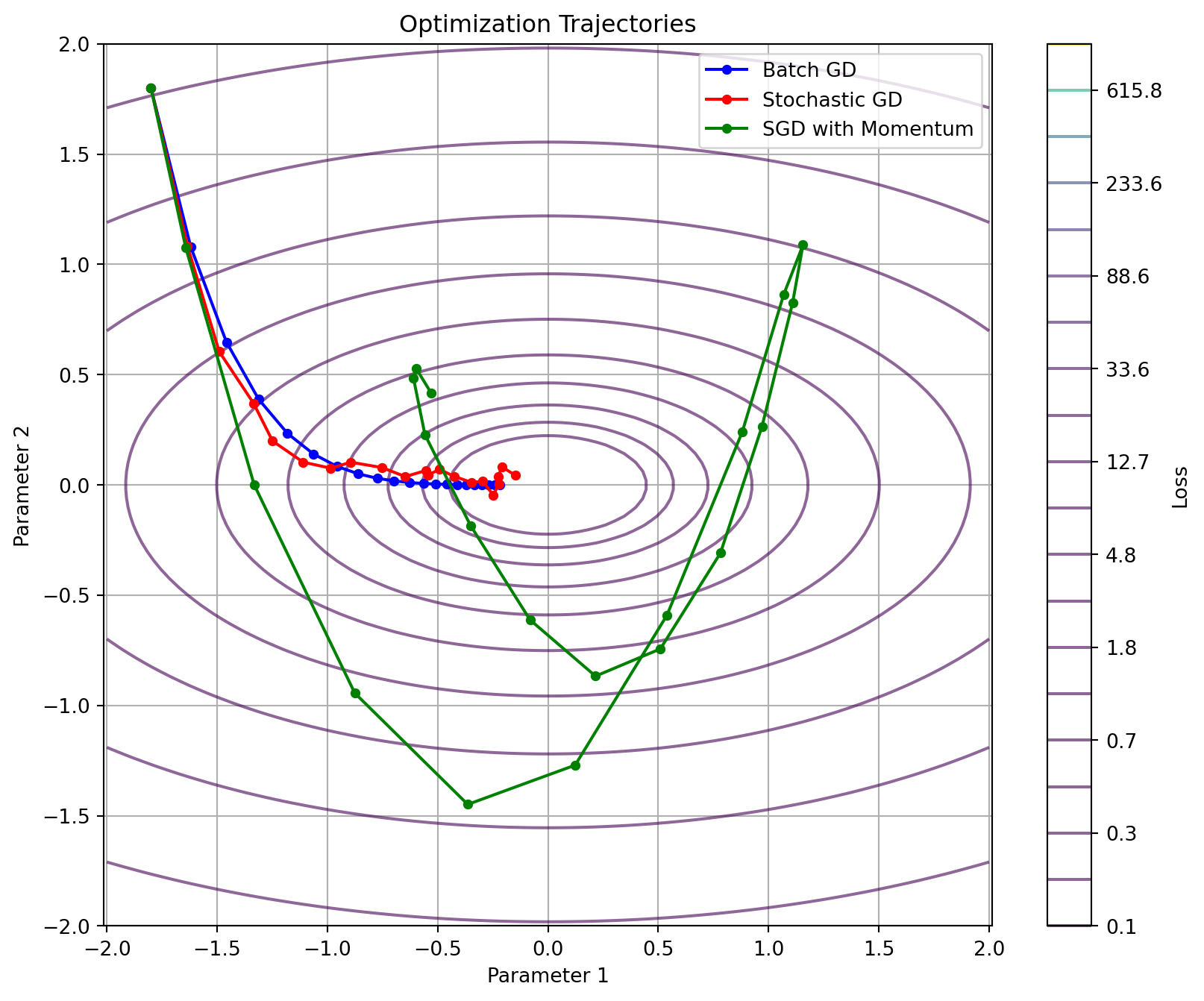 import numpy as npimport matplotlib.pyplot as pltdef plot_sgd_variants():"""Visualize optimization trajectories for different SGD variants"""# Generate a simple loss surface x = np.linspace(-2, 2, 100) y = np.linspace(-2, 2, 100) X, Y = np.meshgrid(x, y) Z =0.5* X**2+2* Y**2# Simple quadratic function# Create optimization paths# Starting point start_x, start_y =-1.8, 1.8# Batch GD - steady path batch_path_x, batch_path_y = [start_x], [start_y] x_curr, y_curr = start_x, start_y lr =0.1for _ inrange(20):# Gradient of our function: [x, 4y] grad_x, grad_y = x_curr, 4* y_curr x_curr -= lr * grad_x y_curr -= lr * grad_y batch_path_x.append(x_curr) batch_path_y.append(y_curr)# SGD - noisy path sgd_path_x, sgd_path_y = [start_x], [start_y] x_curr, y_curr = start_x, start_yfor _ inrange(20):# Add noise to gradients to simulate stochasticity noise_x = np.random.normal(0, 0.3) noise_y = np.random.normal(0, 0.3) grad_x, grad_y = x_curr + noise_x, 4* y_curr + noise_y x_curr -= lr * grad_x y_curr -= lr * grad_y sgd_path_x.append(x_curr) sgd_path_y.append(y_curr)# SGD with momentum - smoother path with inertia momentum_path_x, momentum_path_y = [start_x], [start_y] x_curr, y_curr = start_x, start_y vx, vy =0, 0# Initialize velocity beta =0.9# Momentum parameterfor _ inrange(20):# Add noise to gradients to simulate stochasticity noise_x = np.random.normal(0, 0.3) noise_y = np.random.normal(0, 0.3) grad_x, grad_y = x_curr + noise_x, 4* y_curr + noise_y# Update with momentum vx = beta * vx - lr * grad_x vy = beta * vy - lr * grad_y x_curr += vx y_curr += vy momentum_path_x.append(x_curr) momentum_path_y.append(y_curr)# Plot plt.figure(figsize=(10, 8))# Plot the contour levels = np.logspace(-1, 3, 20) contour = plt.contour(X, Y, Z, levels=levels, alpha=0.6, cmap='viridis') plt.colorbar(contour, label='Loss')# Plot paths plt.plot(batch_path_x, batch_path_y, 'bo-', label='Batch GD', markersize=4) plt.plot(sgd_path_x, sgd_path_y, 'ro-', label='Stochastic GD', markersize=4) plt.plot(momentum_path_x, momentum_path_y, 'go-', label='SGD with Momentum', markersize=4) plt.title('Optimization Trajectories') plt.xlabel('Parameter 1') plt.ylabel('Parameter 2') plt.legend() plt.grid(True) plt.axis('equal') plt.show()np.random.seed(42)plot_sgd_variants()