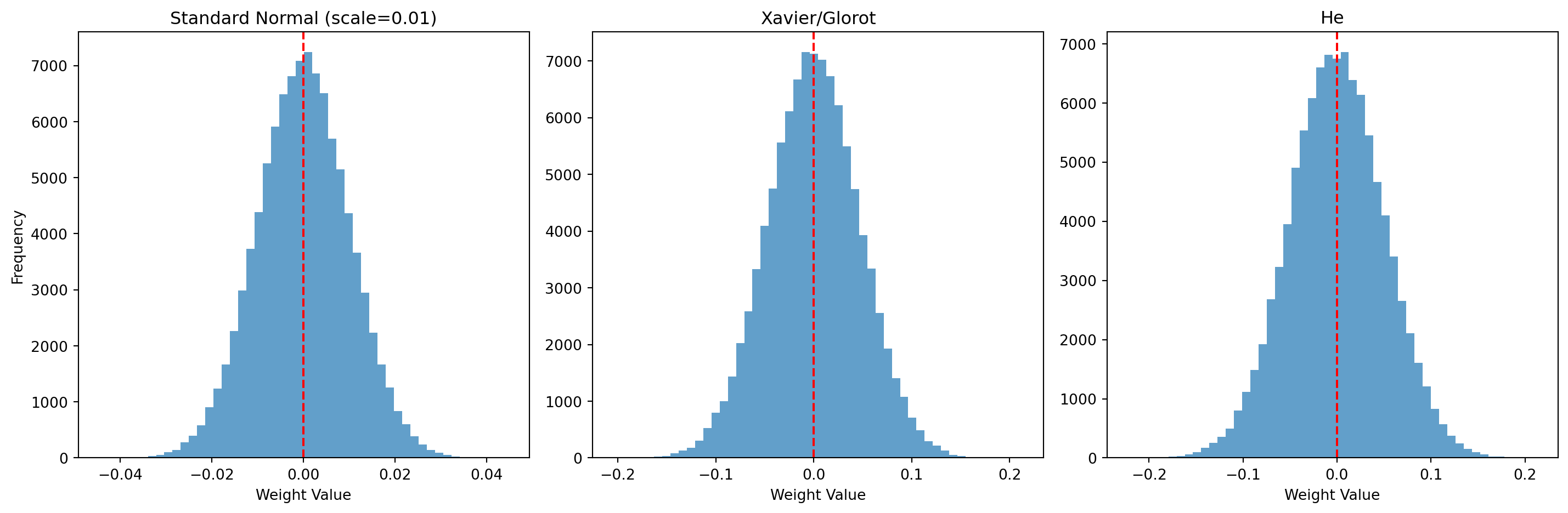 import numpy as npimport matplotlib.pyplot as pltdef visualize_weight_distributions():"""Visualize weight distributions for different initialization methods"""# Initialize weights for a network with layers [784, 128, 64, 10] np.random.seed(42)# Layer sizes for a typical MNIST network layer_sizes = [784, 128, 64, 10]# Standard normal (scale=0.01) std_weights = [np.random.randn(layer_sizes[i+1], layer_sizes[i]) *0.01for i inrange(len(layer_sizes)-1)]# Xavier/Glorot xavier_weights = [np.random.randn(layer_sizes[i+1], layer_sizes[i]) * np.sqrt(2/(layer_sizes[i]+layer_sizes[i+1])) for i inrange(len(layer_sizes)-1)]# He he_weights = [np.random.randn(layer_sizes[i+1], layer_sizes[i]) * np.sqrt(2/layer_sizes[i]) for i inrange(len(layer_sizes)-1)]# Plot distributions for the first hidden layer layer_idx =0# First layer (784 -> 128) plt.figure(figsize=(15, 5))# Standard normal plt.subplot(1, 3, 1) plt.hist(std_weights[layer_idx].flatten(), bins=50, alpha=0.7) plt.title(f'Standard Normal (scale=0.01)') plt.xlabel('Weight Value') plt.ylabel('Frequency') plt.axvline(x=0, color='r', linestyle='--')# Xavier/Glorot plt.subplot(1, 3, 2) plt.hist(xavier_weights[layer_idx].flatten(), bins=50, alpha=0.7) plt.title(f'Xavier/Glorot') plt.xlabel('Weight Value') plt.axvline(x=0, color='r', linestyle='--')# He plt.subplot(1, 3, 3) plt.hist(he_weights[layer_idx].flatten(), bins=50, alpha=0.7) plt.title(f'He') plt.xlabel('Weight Value') plt.axvline(x=0, color='r', linestyle='--') plt.tight_layout() plt.show()# Print variance statisticsprint("Weight variance statistics for Layer 1 (784 -> 128):")print(f"Standard Normal (0.01): {np.var(std_weights[layer_idx]):.8f}")print(f"Xavier/Glorot: {np.var(xavier_weights[layer_idx]):.8f}")print(f"He: {np.var(he_weights[layer_idx]):.8f}")print(f"Theoretical Xavier/Glorot: {2/(layer_sizes[0]+layer_sizes[1]):.8f}")print(f"Theoretical He: {2/layer_sizes[0]:.8f}")visualize_weight_distributions()