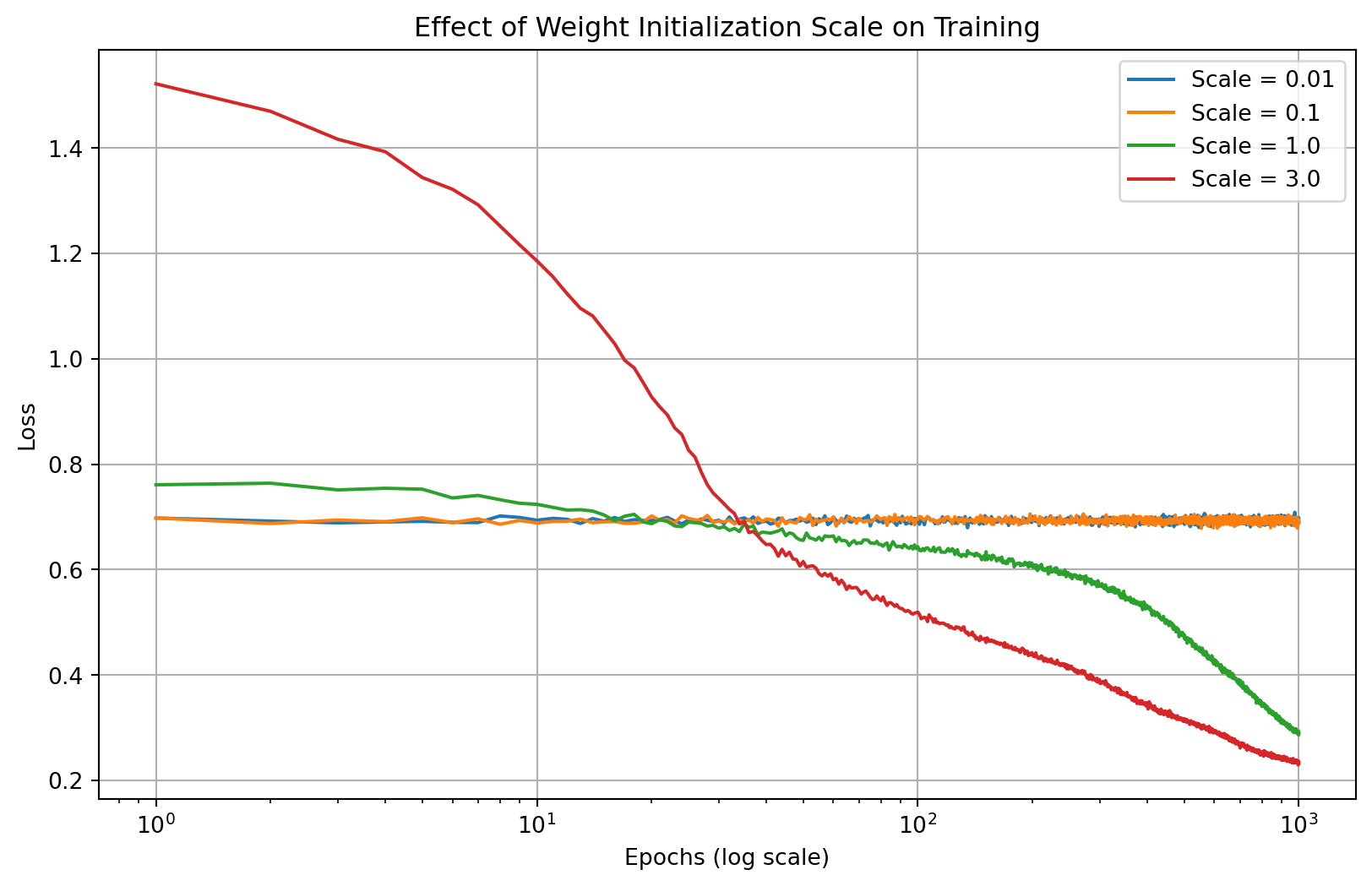 import numpy as npimport matplotlib.pyplot as pltdef demonstrate_initialization_effects():"""Visualize how different initialization strategies affect training"""# Set up a simple problem np.random.seed(42)# Generate synthetic data: XOR-like problem X = np.array([[0, 0], [0, 1], [1, 0], [1, 1]]) y = np.array([[0], [1], [1], [0]])def run_training_simulation(init_scale, n_runs=10, n_epochs=1000): loss_histories = np.zeros((n_runs, n_epochs))for run inrange(n_runs):# Initialize a simple 2-layer network W1 = np.random.randn(2, 2) * init_scale b1 = np.zeros((2, 1)) W2 = np.random.randn(1, 2) * init_scale b2 = np.zeros((1, 1))# Simplified training loopfor epoch inrange(n_epochs):# Forward pass Z1 = np.dot(X, W1.T) + b1.T A1 = np.tanh(Z1) Z2 = np.dot(A1, W2.T) + b2.T A2 =1/ (1+ np.exp(-Z2)) # Sigmoid# Compute loss loss =-np.mean(y * np.log(A2 +1e-10) + (1- y) * np.log(1- A2 +1e-10)) loss_histories[run, epoch] = loss# Backward pass (simplified for simulation) dZ2 = A2 - y dW2 = np.dot(dZ2.T, A1) / X.shape[0] db2 = np.sum(dZ2, axis=0, keepdims=True).T / X.shape[0] dA1 = np.dot(dZ2, W2) dZ1 = dA1 * (1- A1**2) # tanh derivative dW1 = np.dot(dZ1.T, X) / X.shape[0] db1 = np.sum(dZ1, axis=0, keepdims=True).T / X.shape[0]# Update parameters lr =0.1 W1 -= lr * dW1 b1 -= lr * db1 W2 -= lr * dW2 b2 -= lr * db2# Add some noise to make the curves look more realistic noise = np.random.normal(0, 0.02, loss_histories.shape) loss_histories = loss_histories + noise * loss_historiesreturn np.mean(loss_histories, axis=0)# Compare different initialization scales init_scales = [0.01, 0.1, 1.0, 3.0] results = [run_training_simulation(scale) for scale in init_scales]# Plot results plt.figure(figsize=(10, 6)) epochs =range(1, 1001)for i, scale inenumerate(init_scales): plt.plot(epochs, results[i], label=f'Scale = {scale}') plt.xscale('log') plt.xlabel('Epochs (log scale)') plt.ylabel('Loss') plt.title('Effect of Weight Initialization Scale on Training') plt.legend() plt.grid(True) plt.show()demonstrate_initialization_effects()