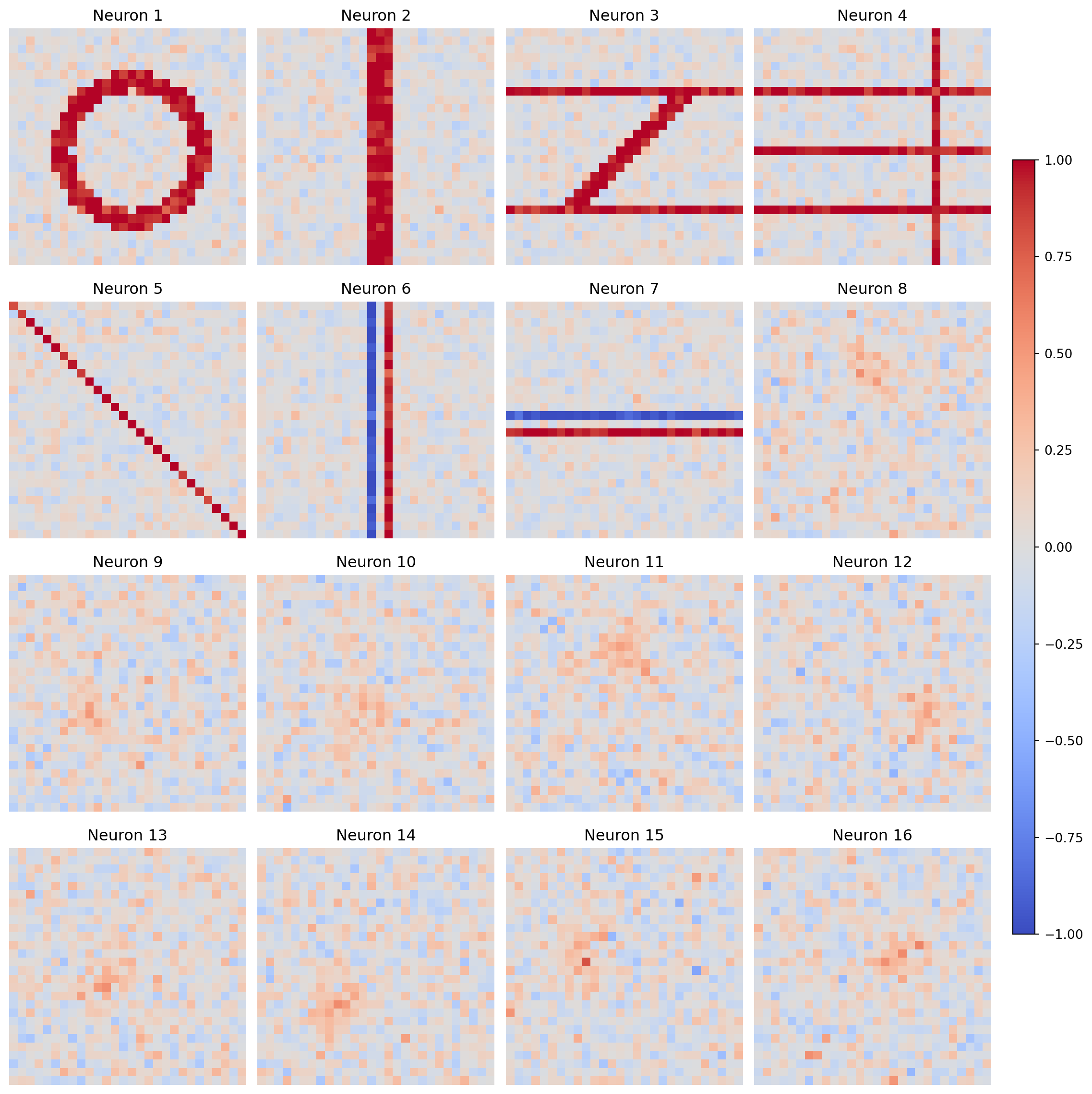 import numpy as npimport matplotlib.pyplot as pltdef visualize_mnist_weights():"""Simulate and visualize weights from a network trained on MNIST"""# Simulate weights that might develop when training on MNIST np.random.seed(42)# Create a grid of artificial weight patterns (simulating features learned from MNIST) n_neurons =16 img_size =28# Initialize random weights weights = np.random.randn(n_neurons, img_size, img_size) *0.01# Modify weights to simulate learned patterns digit_patterns = []# Simulate digit 0 (circle) pattern0 = np.zeros((img_size, img_size))for i inrange(img_size):for j inrange(img_size):if ((i-img_size/2)**2+ (j-img_size/2)**2< (img_size/3)**2) and\ ((i-img_size/2)**2+ (j-img_size/2)**2> (img_size/4)**2): pattern0[i, j] =1 digit_patterns.append(pattern0)# Simulate digit 1 (vertical line) pattern1 = np.zeros((img_size, img_size)) pattern1[:, img_size//2-1:img_size//2+2] =1 digit_patterns.append(pattern1)# Simulate digit 2 (top and bottom horizontal lines with diagonal) pattern2 = np.zeros((img_size, img_size)) pattern2[img_size//4, :] =1 pattern2[3*img_size//4, :] =1for i inrange(img_size//4, 3*img_size//4): j =3*img_size//4- (i - img_size//4) pattern2[i, j-1:j+2] =1 digit_patterns.append(pattern2)# Simulate digit 3 (horizontal lines with gaps) pattern3 = np.zeros((img_size, img_size)) pattern3[img_size//4, :] =1 pattern3[img_size//2, :] =1 pattern3[3*img_size//4, :] =1 pattern3[:, 3*img_size//4] =1 digit_patterns.append(pattern3)# Simulate stroke detector (diagonal line) stroke1 = np.zeros((img_size, img_size))for i inrange(img_size): j = iif0<= j < img_size: stroke1[i, j] =1 digit_patterns.append(stroke1)# Simulate vertical edge detector edge1 = np.zeros((img_size, img_size)) edge1[:, img_size//2-1] =-1 edge1[:, img_size//2+1] =1 digit_patterns.append(edge1)# Simulate horizontal edge detector edge2 = np.zeros((img_size, img_size)) edge2[img_size//2-1, :] =-1 edge2[img_size//2+1, :] =1 digit_patterns.append(edge2)# Create the rest as noise with some structurefor i inrange(n_neurons -len(digit_patterns)): pattern = np.random.randn(img_size, img_size) *0.1# Add some structure (random blob) center_i = np.random.randint(img_size//4, 3*img_size//4) center_j = np.random.randint(img_size//4, 3*img_size//4)for i_idx inrange(img_size):for j_idx inrange(img_size): dist = np.sqrt((i_idx-center_i)**2+ (j_idx-center_j)**2)if dist < img_size//5: pattern[i_idx, j_idx] +=0.5* np.exp(-dist/(img_size//10)) digit_patterns.append(pattern)# Assign patterns to weightsfor i inrange(n_neurons): weights[i] = digit_patterns[i] + np.random.randn(img_size, img_size) *0.1# Flatten weights for visualization weights_flat = weights.reshape(n_neurons, img_size*img_size)# Plot weights fig, axes = plt.subplots(4, 4, figsize=(12, 12))for i, ax inenumerate(axes.flat):if i < n_neurons: im = ax.imshow(weights[i], cmap='coolwarm', vmin=-1, vmax=1) ax.set_title(f'Neuron {i+1}') ax.axis('off') plt.tight_layout() plt.subplots_adjust(right=0.9) cbar_ax = fig.add_axes([0.92, 0.15, 0.02, 0.7]) fig.colorbar(im, cax=cbar_ax) plt.show()visualize_mnist_weights()
