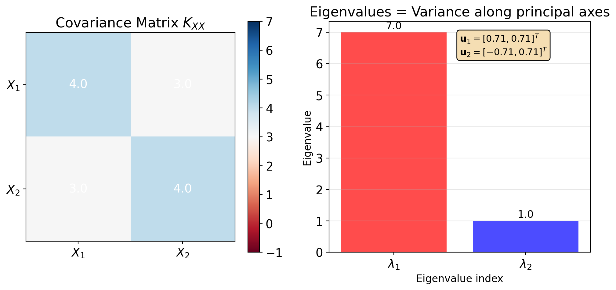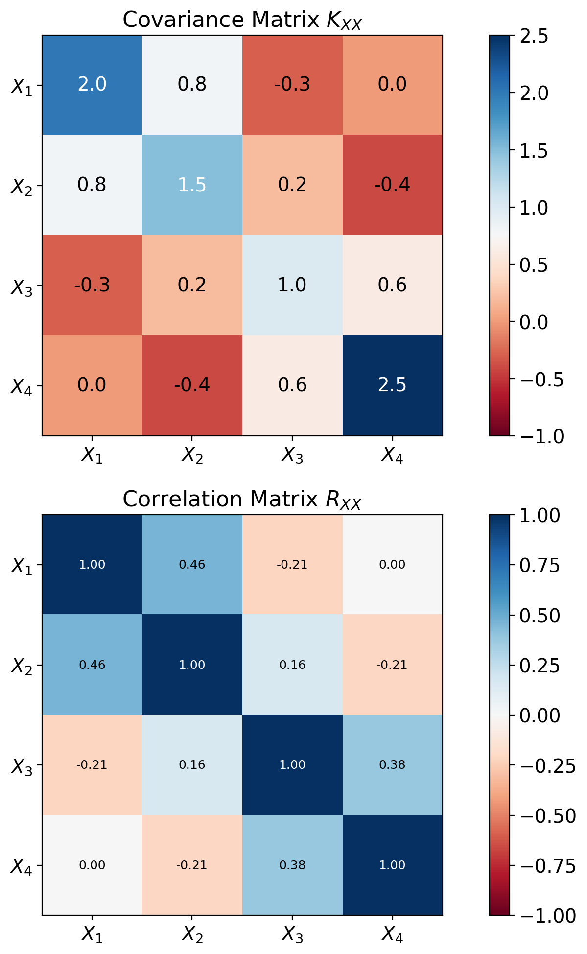 Covariance matrix: \[K_{\mathbf{XX}} = \mathbb{E}[(\mathbf{X} - \boldsymbol{\mu})(\mathbf{X} - \boldsymbol{\mu})^T]\]