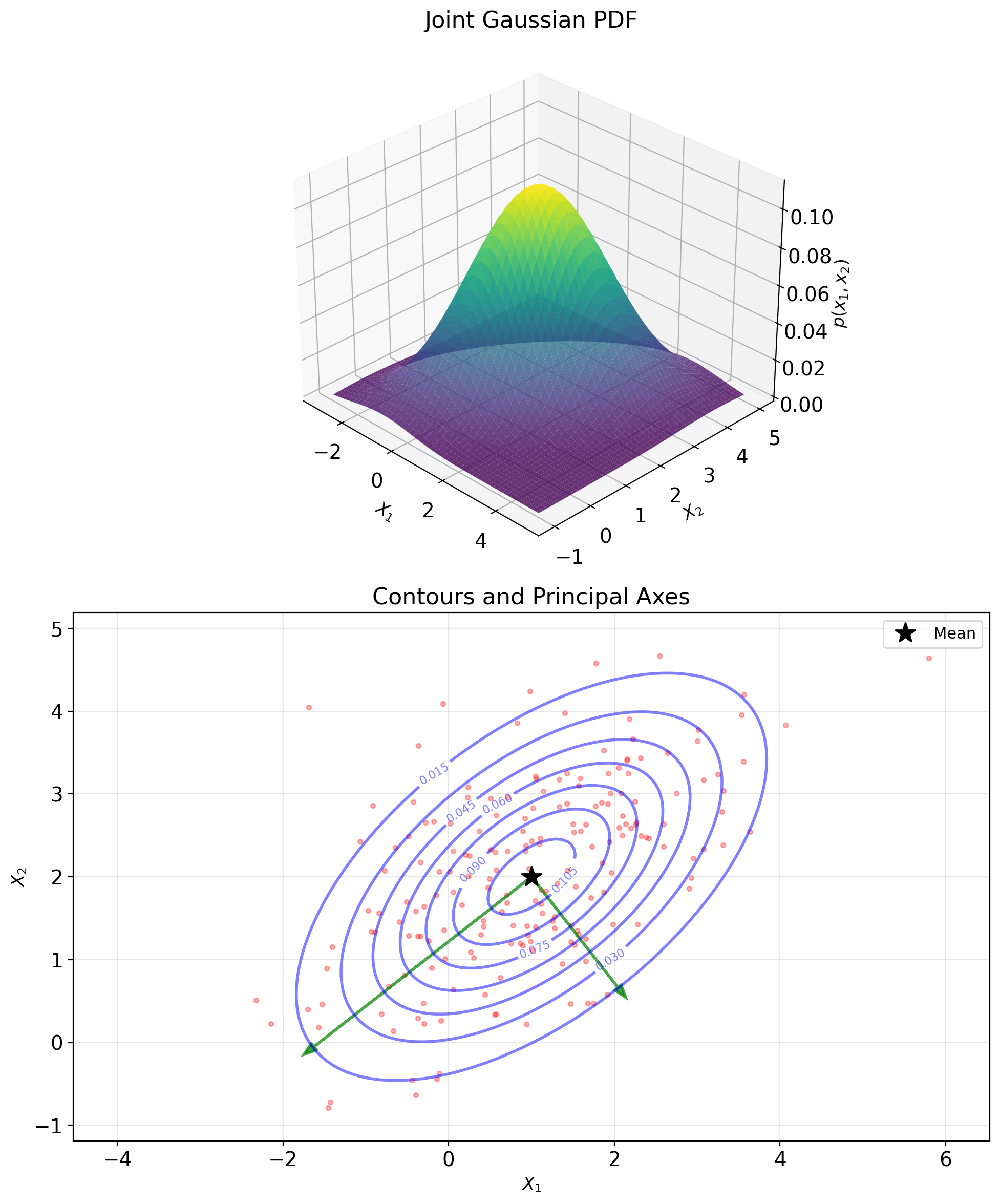 Mean vector: \[\boldsymbol{\mu} = \mathbb{E}[\mathbf{X}] = \begin{bmatrix} \mathbb{E}[X_1] \\ \mathbb{E}[X_2] \\ \vdots \\ \mathbb{E}[X_n] \end{bmatrix}\]