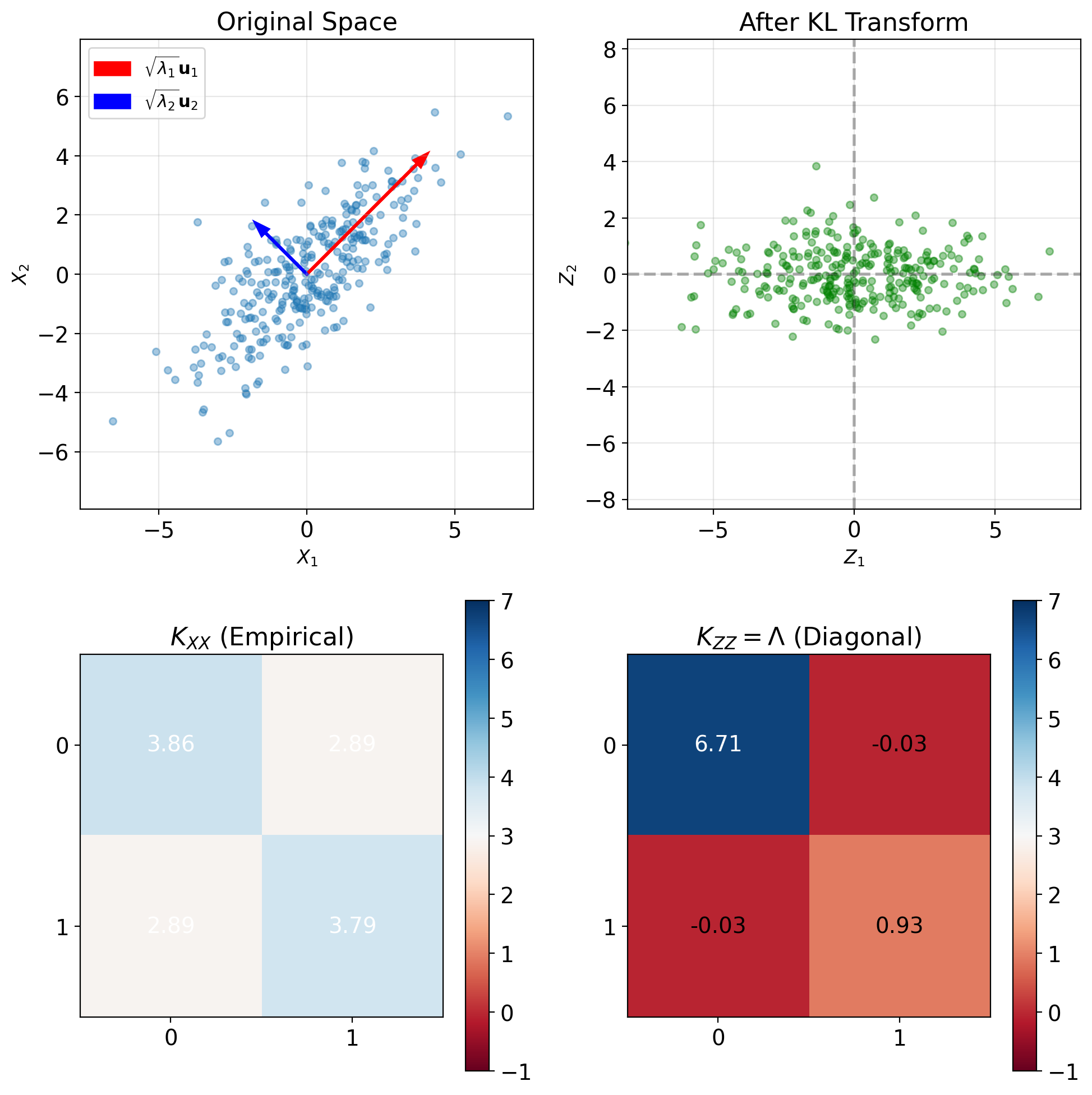 Covariance in new coordinates: \[K_{\mathbf{ZZ}} = \mathbb{E}[\mathbf{Z}\mathbf{Z}^T]\] \[= \mathbb{E}[U^T\mathbf{X}\mathbf{X}^TU]\] \[= U^T\mathbb{E}[\mathbf{X}\mathbf{X}^T]U\] \[= U^TK_{\mathbf{XX}}U\] \[= U^T(U\Lambda U^T)U\] \[= \Lambda\]