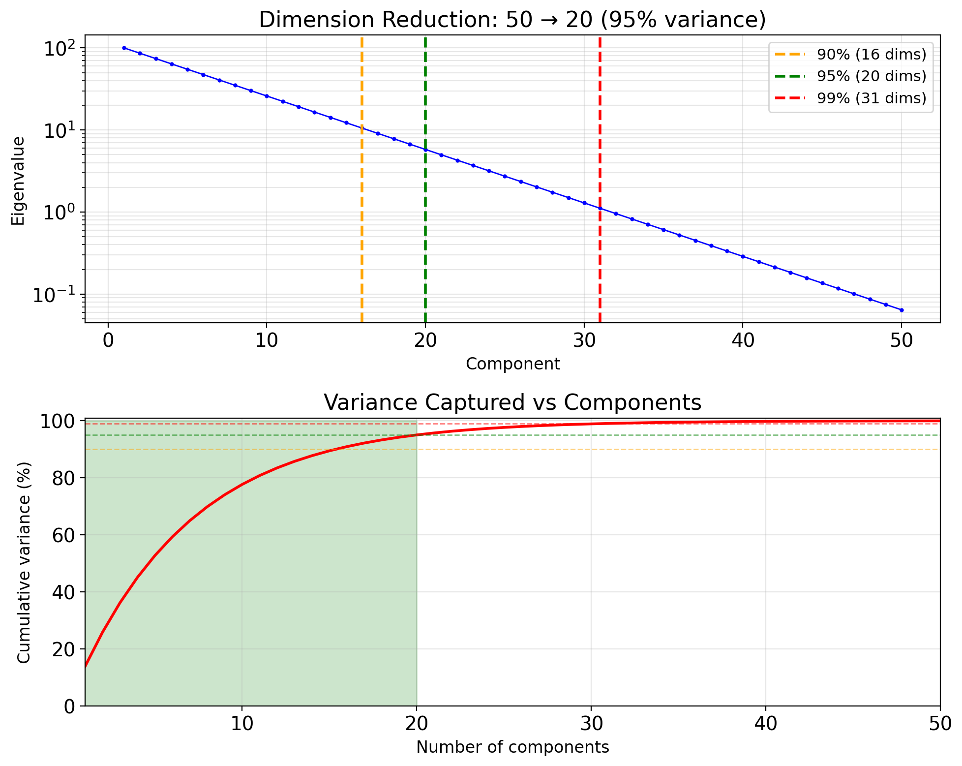 Reconstruction error: \[\mathbb{E}[\|\mathbf{X} - \hat{\mathbf{X}}_k\|^2] = \sum_{i=k+1}^p \lambda_i\]