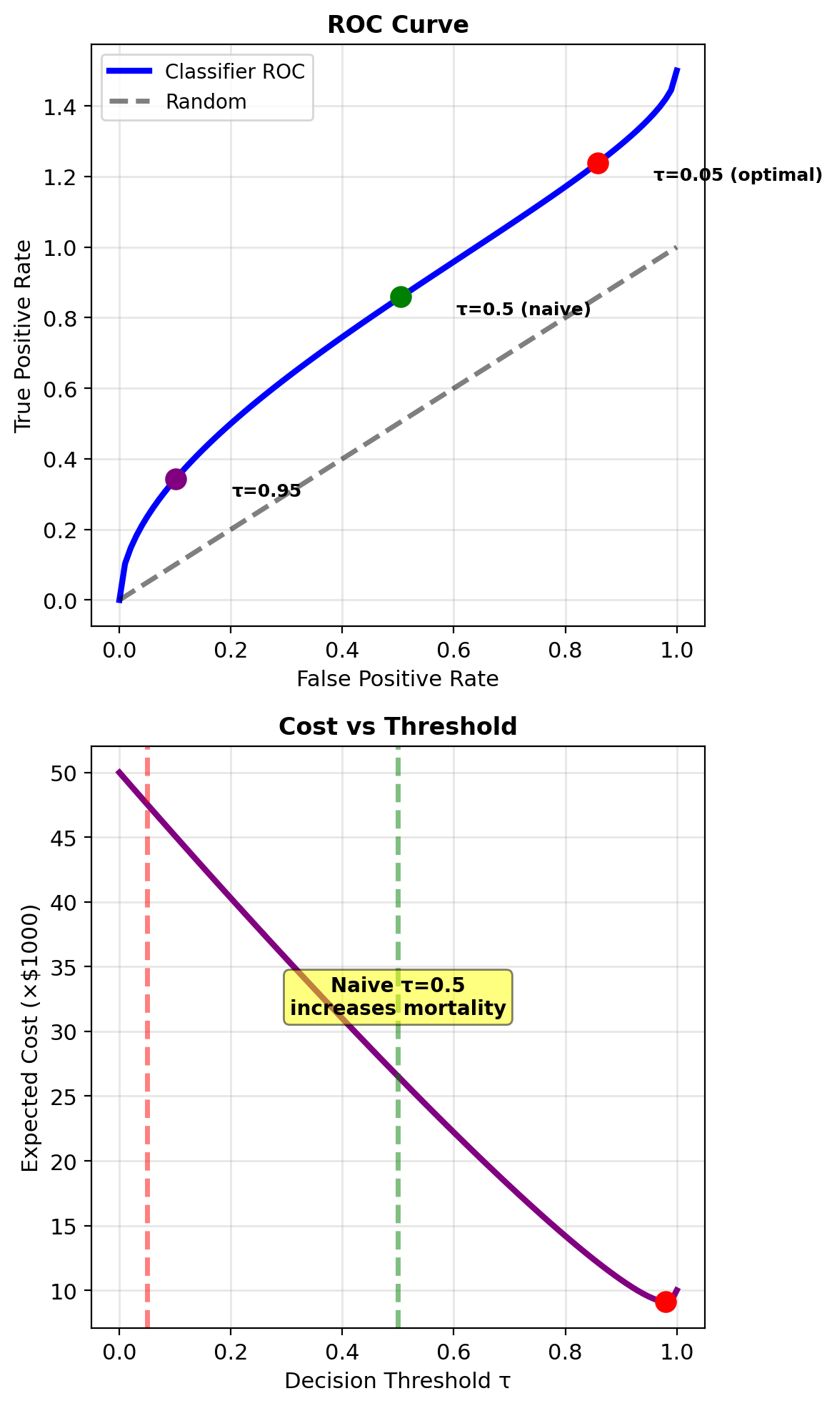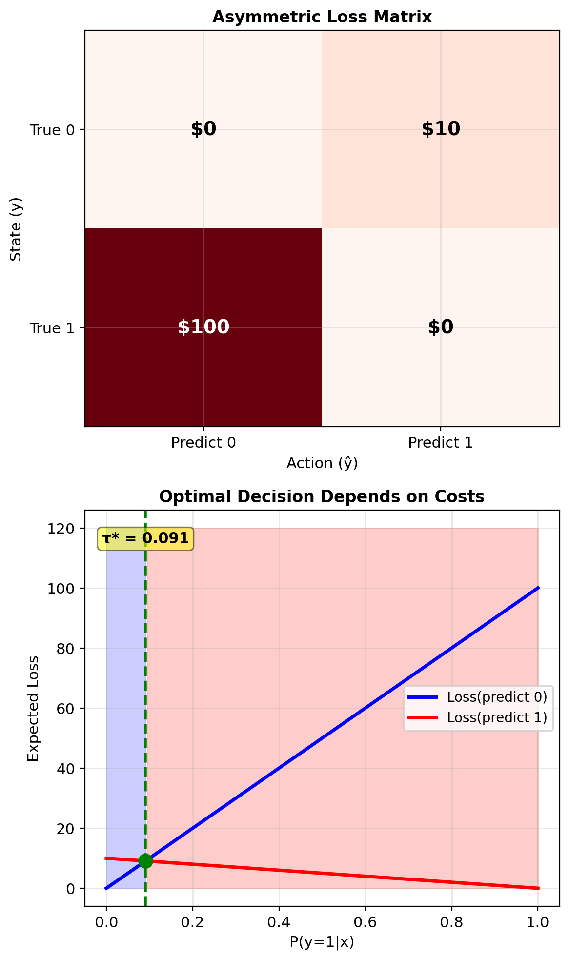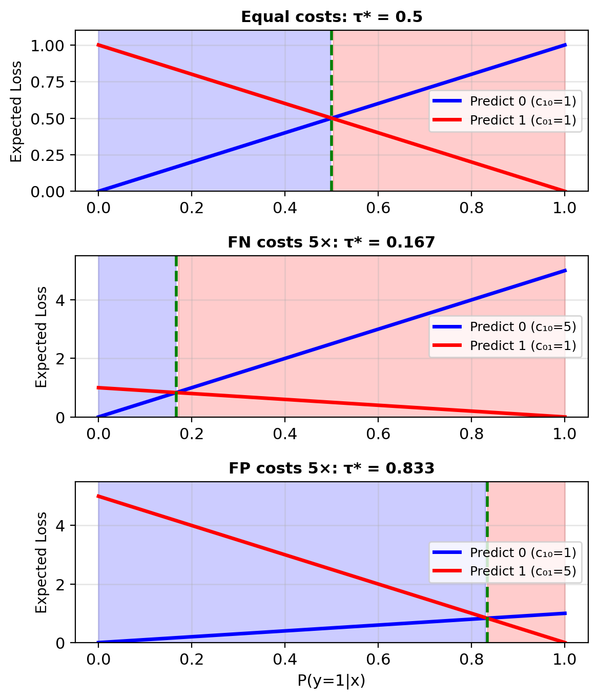Optimal threshold: \(\tau^* = \frac{c_{01}}{c_{01} + c_{10}}\)
