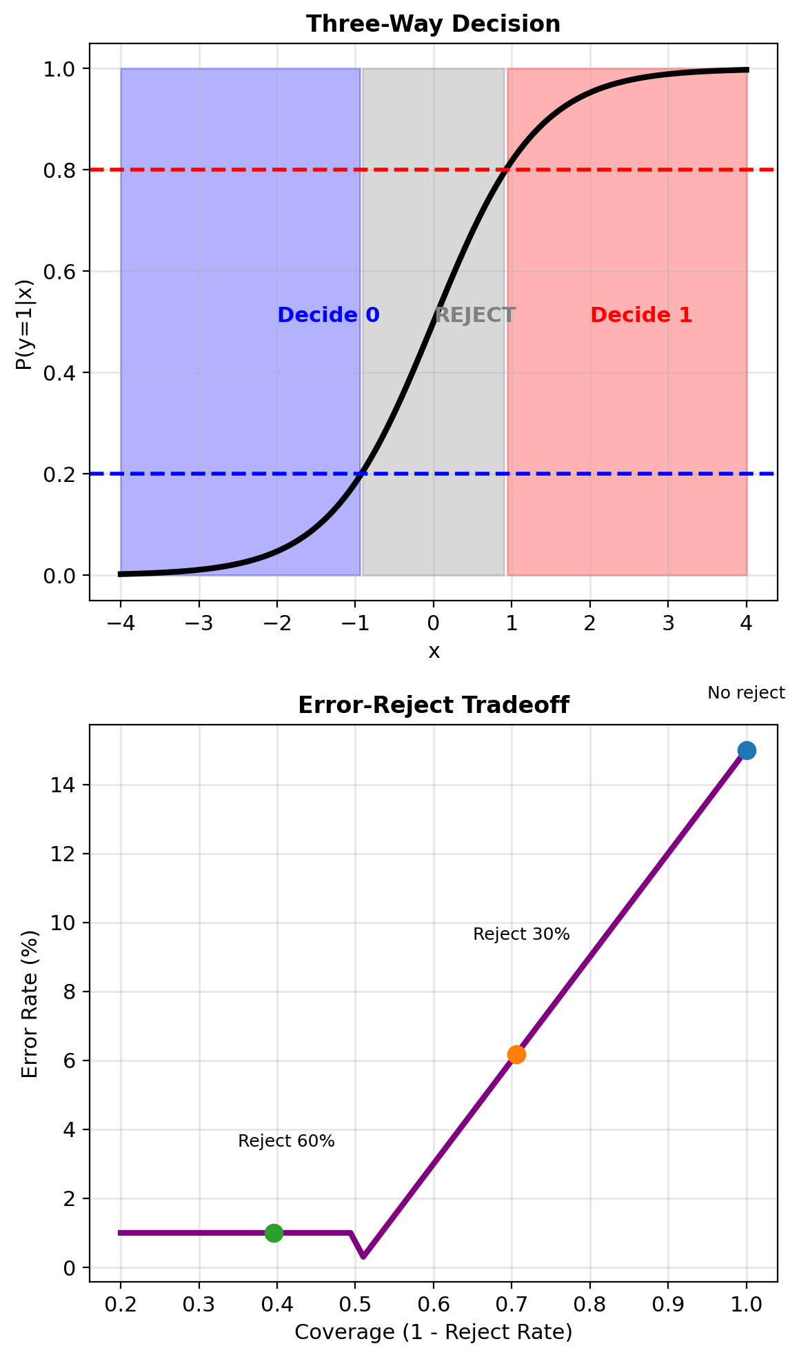 Optimal thresholds (for symmetric costs): \[\tau_1 = \frac{c_r}{c_{10}}, \quad \tau_2 = 1 - \frac{c_r}{c_{01}}\]