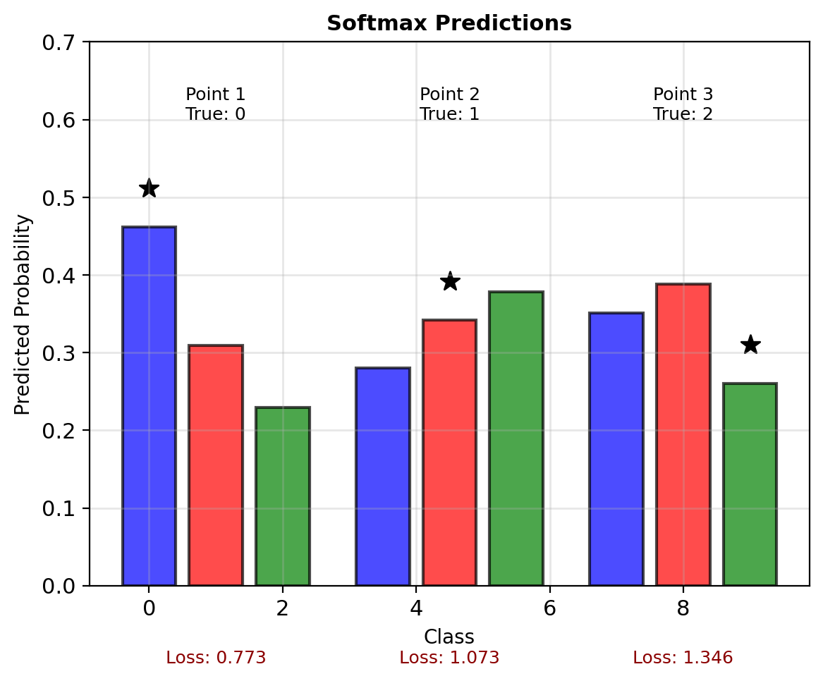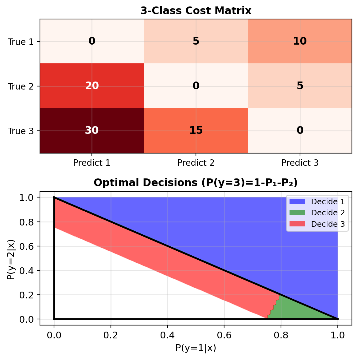 Example: 3-class with varying costs \[L = \begin{bmatrix} 0 & 5 & 10 \\ 20 & 0 & 5 \\ 30 & 15 & 0 \end{bmatrix}\]