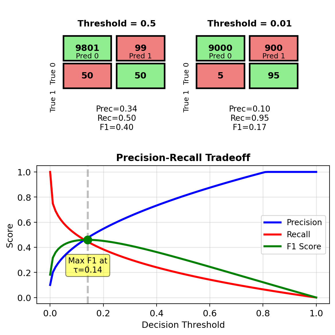Optimal threshold: \[\tau^* = \frac{50,000}{50,000 + 950,000} = 0.05\]