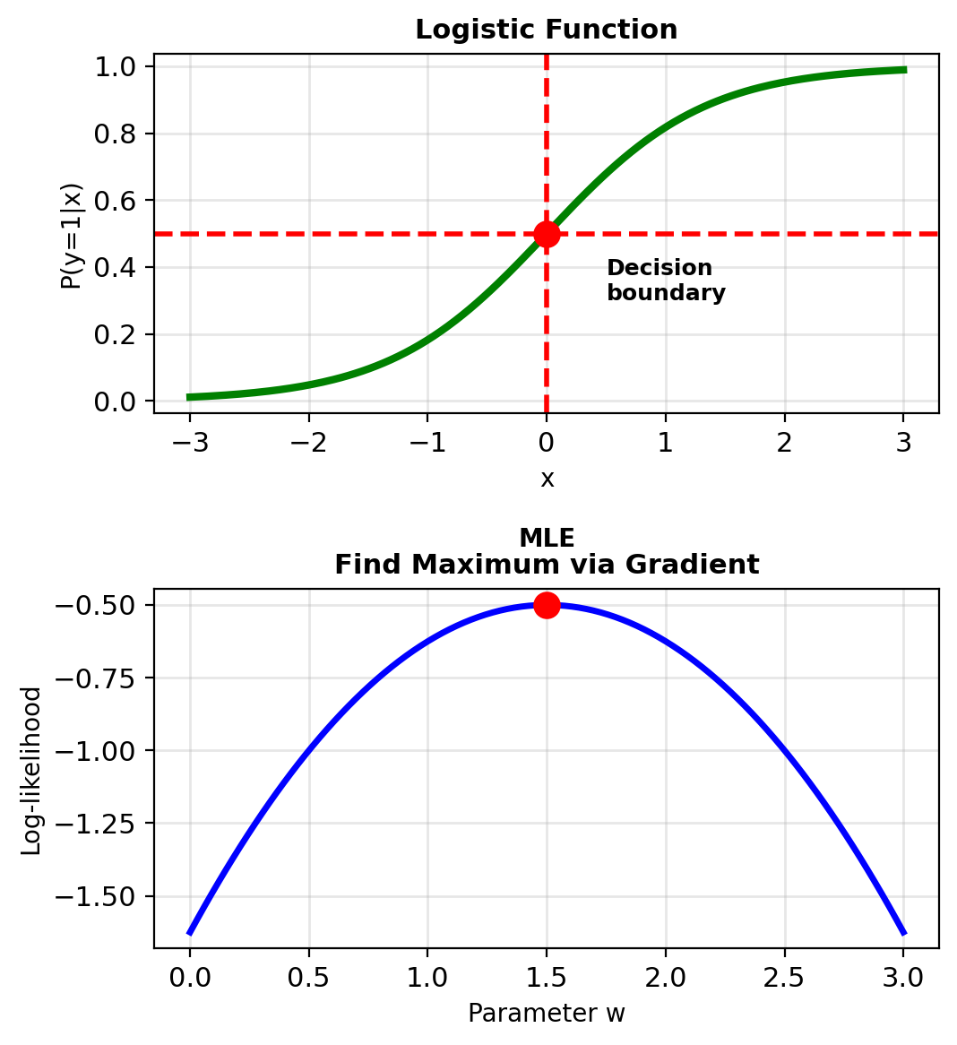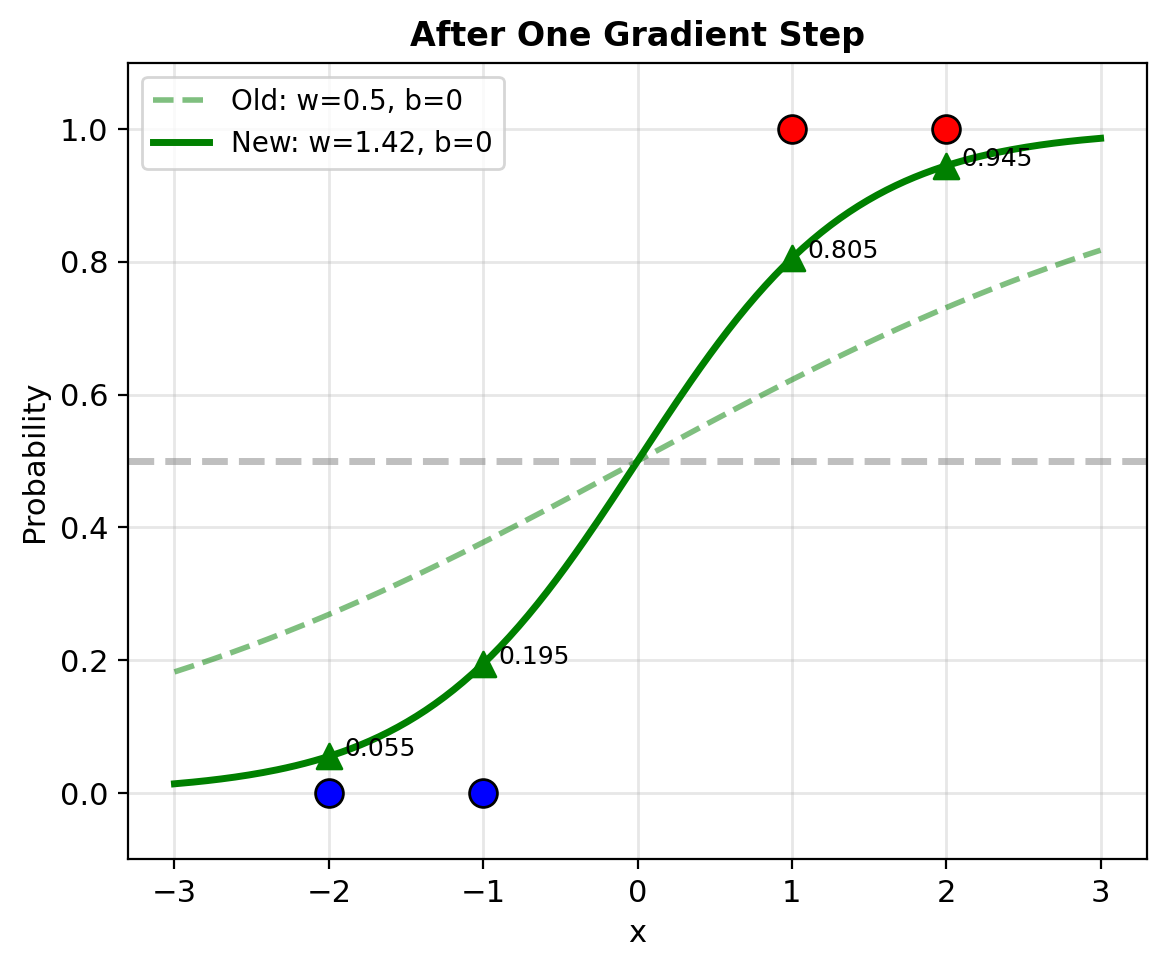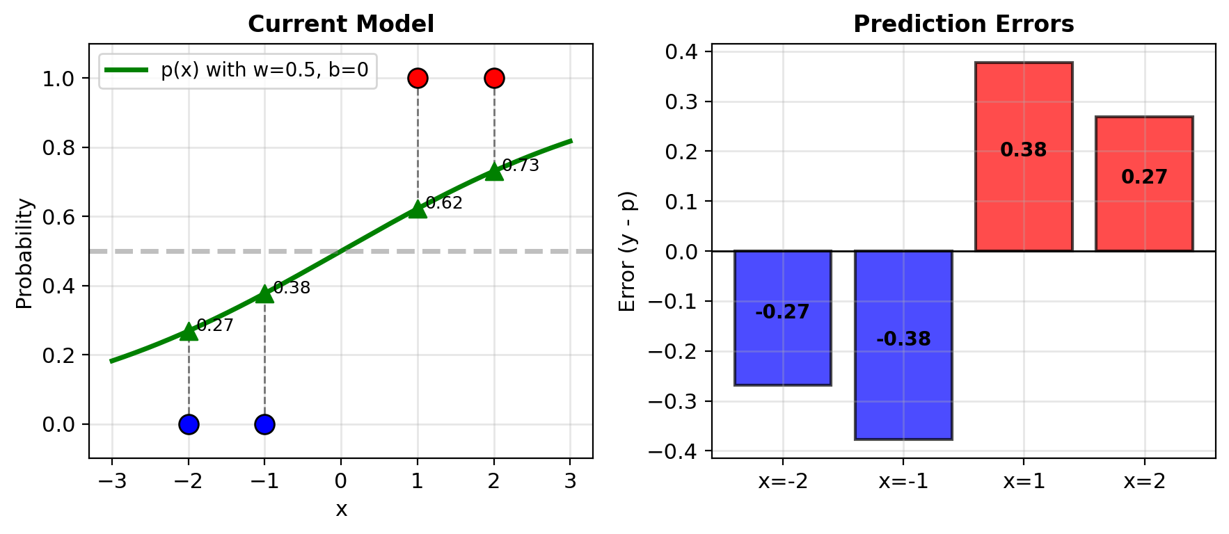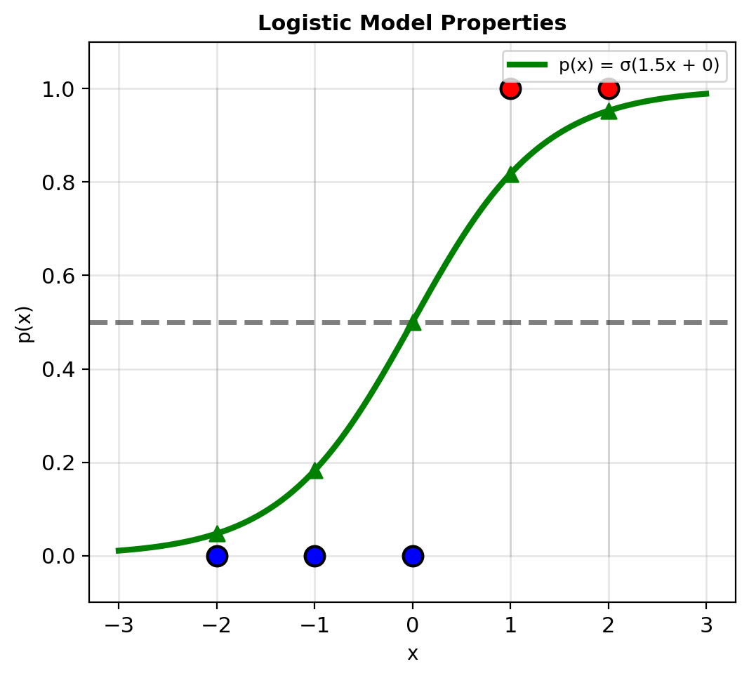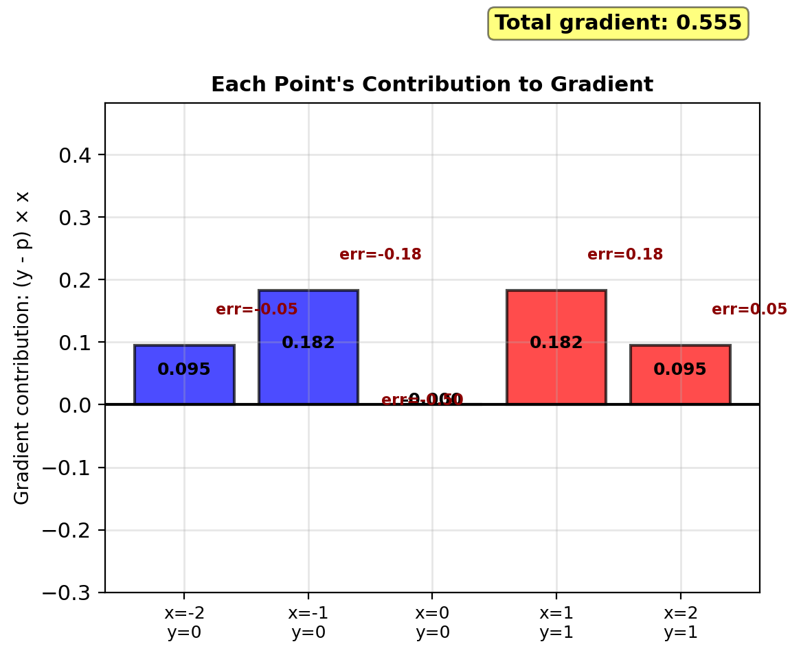 Backward pass (gradient): \[\frac{\partial \ell}{\partial \mathbf{w}} = (y - p)\mathbf{x}\]