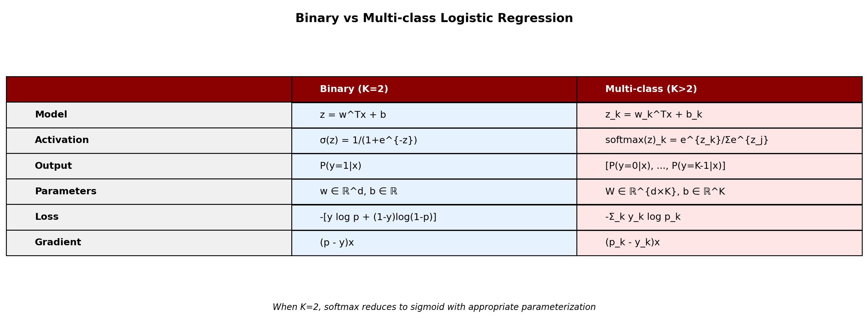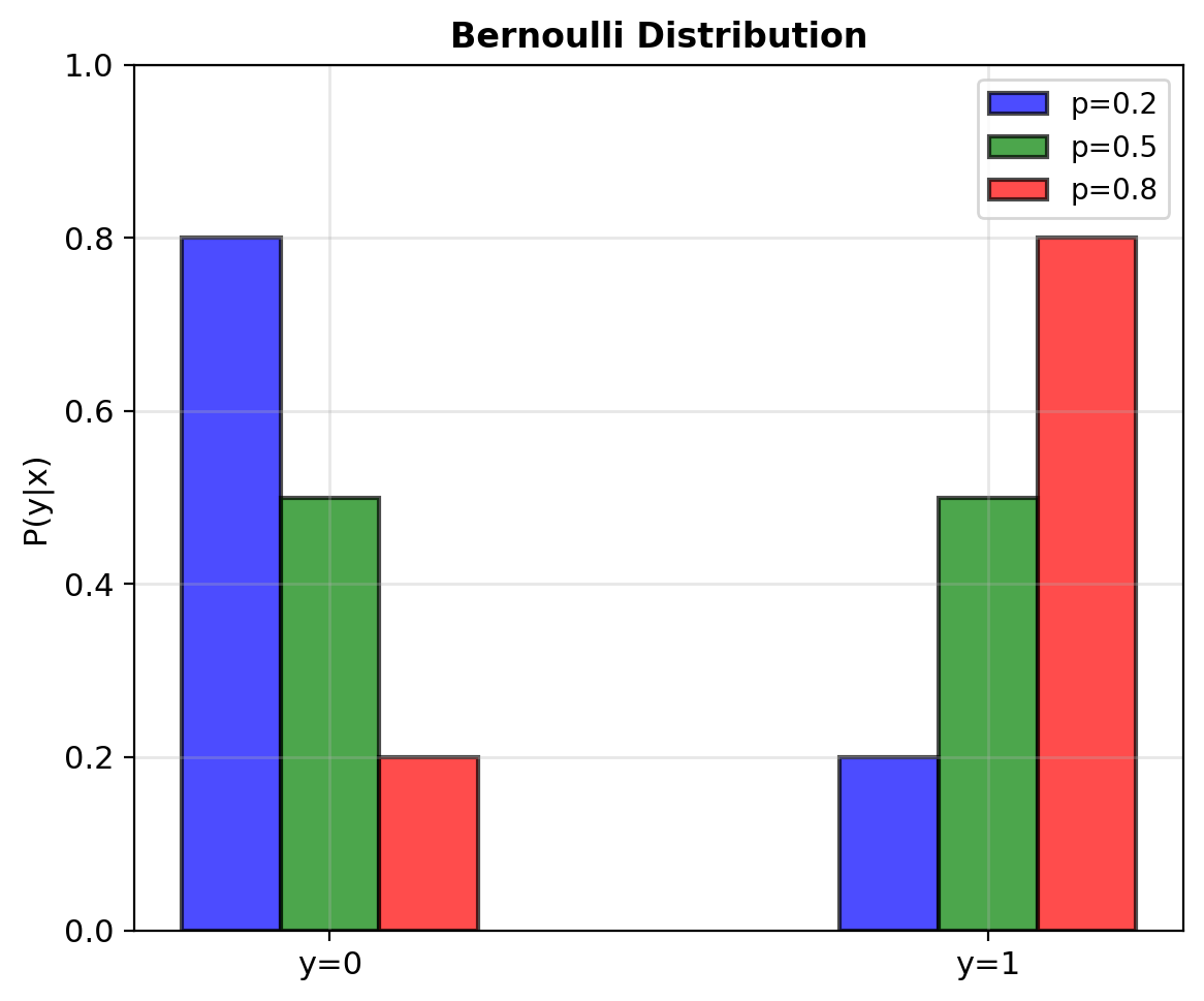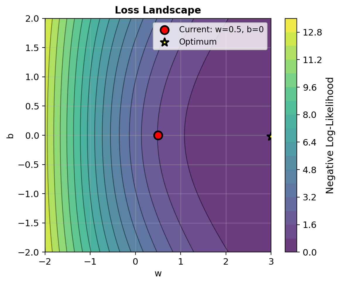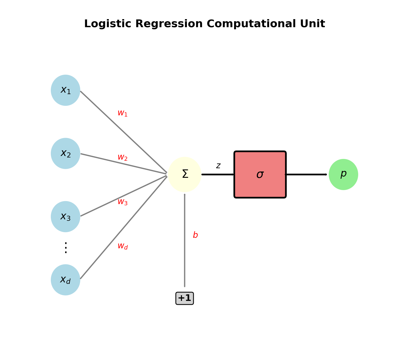 Backward pass (gradient): \[\frac{\partial \ell}{\partial \mathbf{w}} = (y - p)\mathbf{x}\]