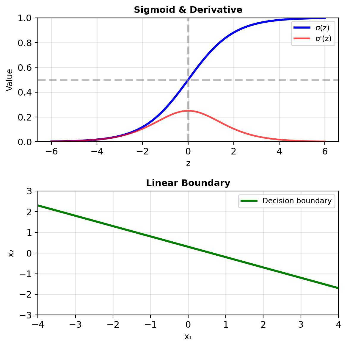 \[z = \mathbf{w}^T\mathbf{x} + b\] \[p = \sigma(z) = \frac{1}{1 + e^{-z}}\]