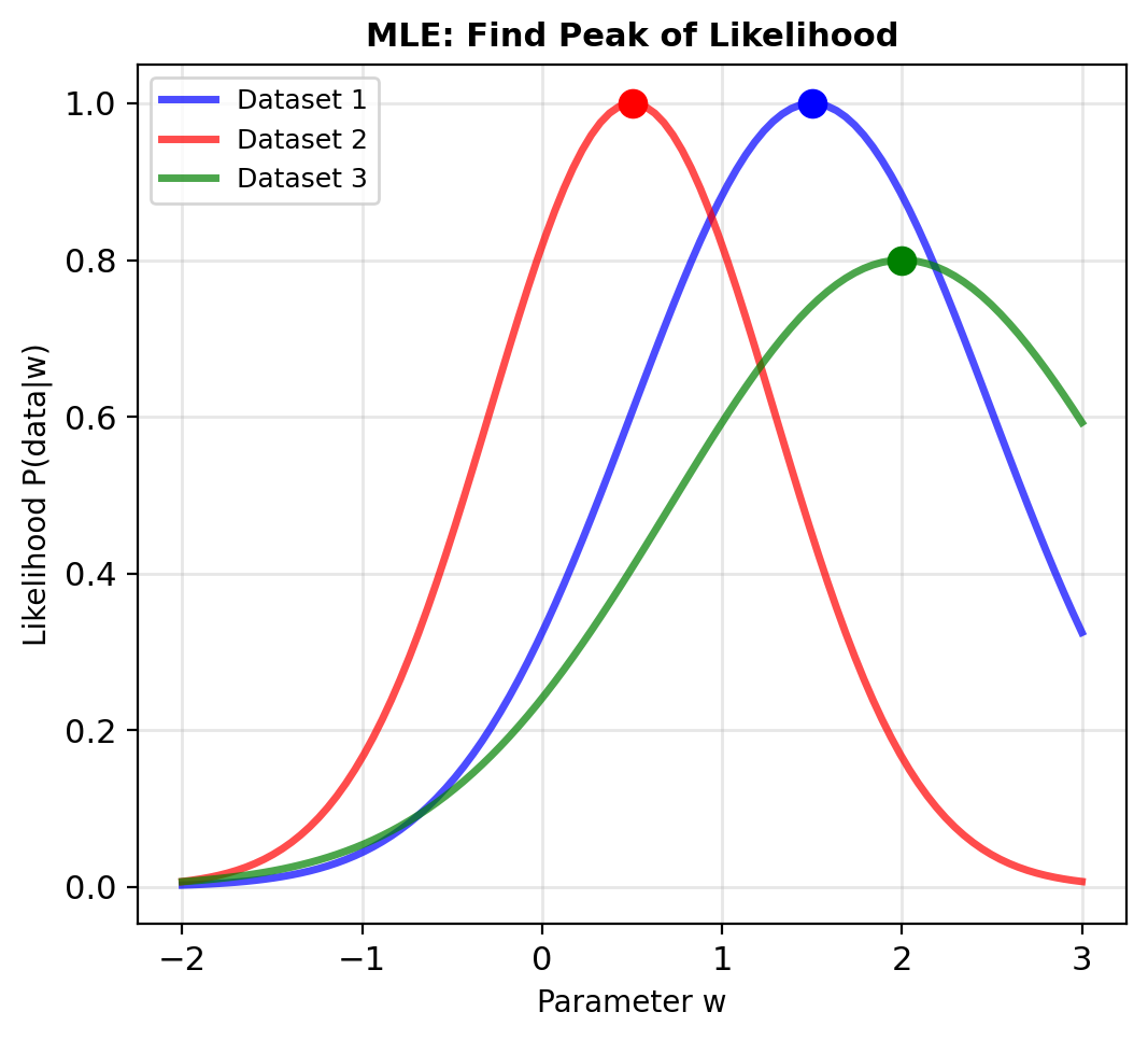 MAP estimation: \[\hat{\mathbf{w}}_{\text{MAP}} = \arg\max_\mathbf{w} P(\mathcal{D}|\mathbf{w})P(\mathbf{w})\]