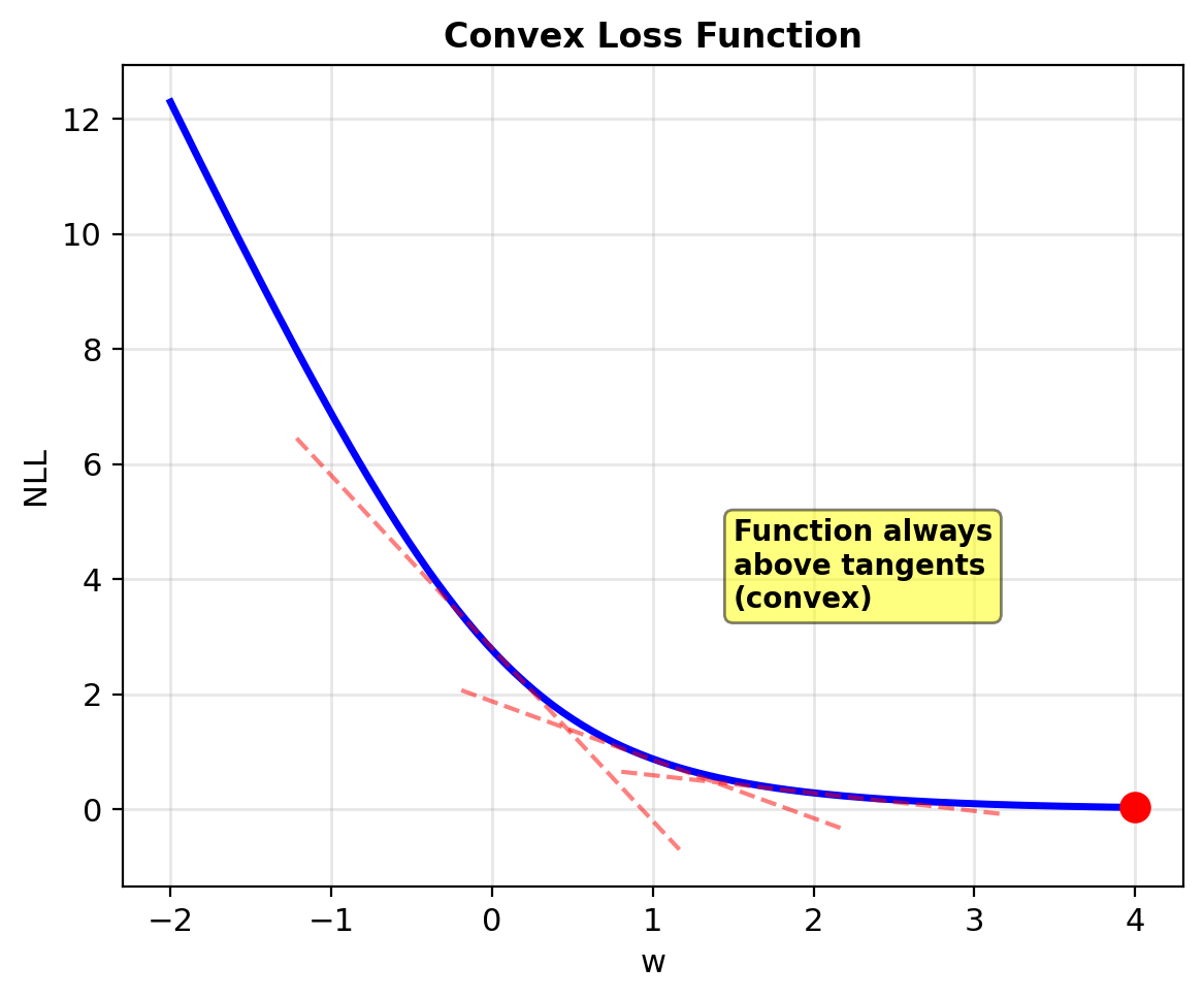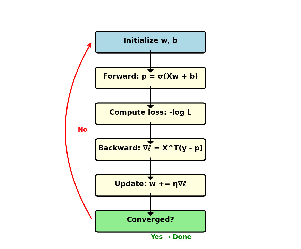 Gradient computation: \[\nabla_\mathbf{w} \mathcal{L} = \mathbf{X}^T(\mathbf{p} - \mathbf{y})\]