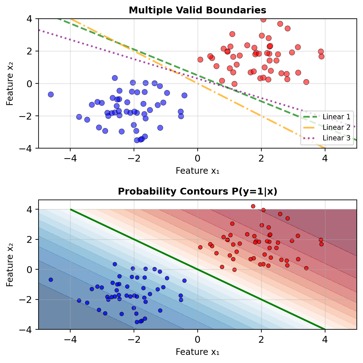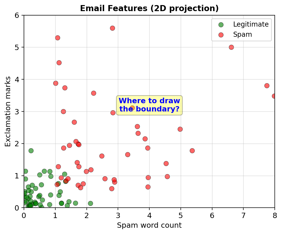 Classical approach: Find decision boundary \[\hat{y} = \begin{cases} 1 & \text{if } f(\mathbf{x}) > 0 \\ 0 & \text{otherwise} \end{cases}\]