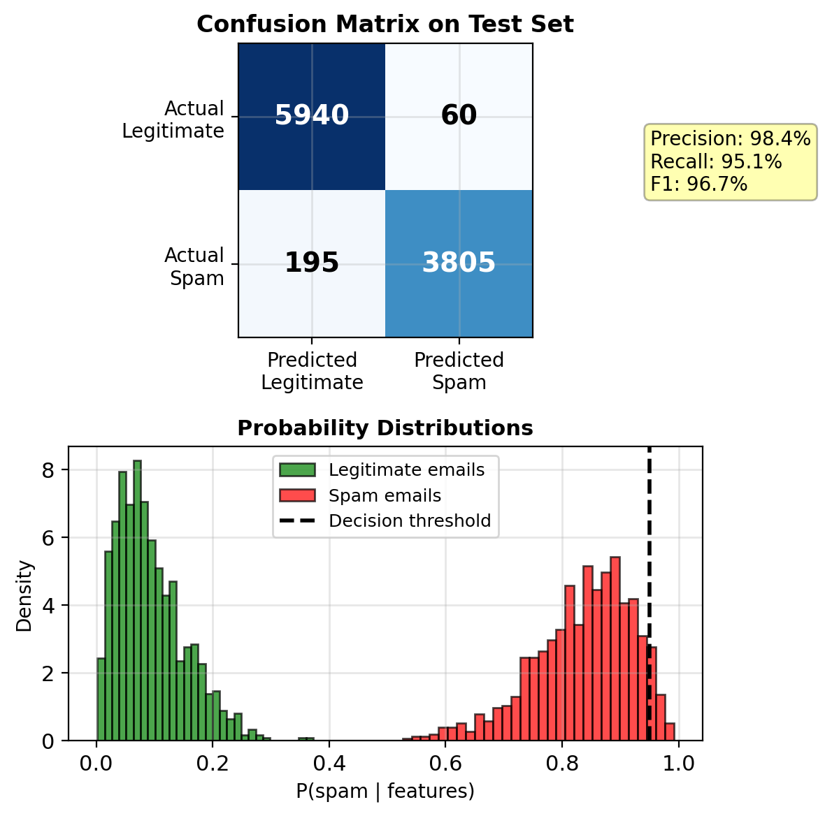 Recall (Sensitivity): Of true positives, how many found? \[\text{Recall} = \frac{\text{TP}}{\text{TP} + \text{FN}}\]
