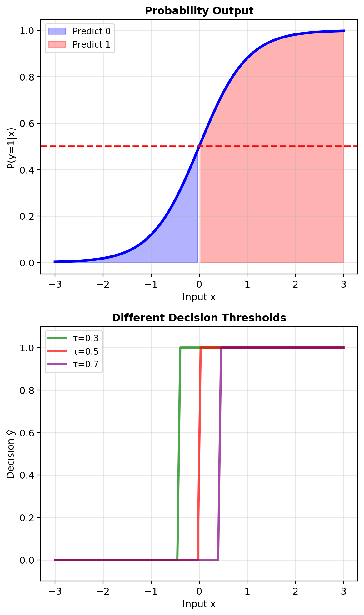 Simple threshold: \[\hat{y} = \begin{cases} 1 & p > 0.5 \\ 0 & p \leq 0.5 \end{cases}\]