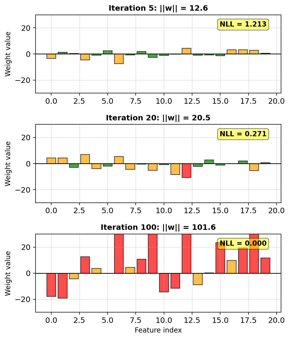 y = (X @ w_true + noise > 0).astype(int)What happens during optimization: