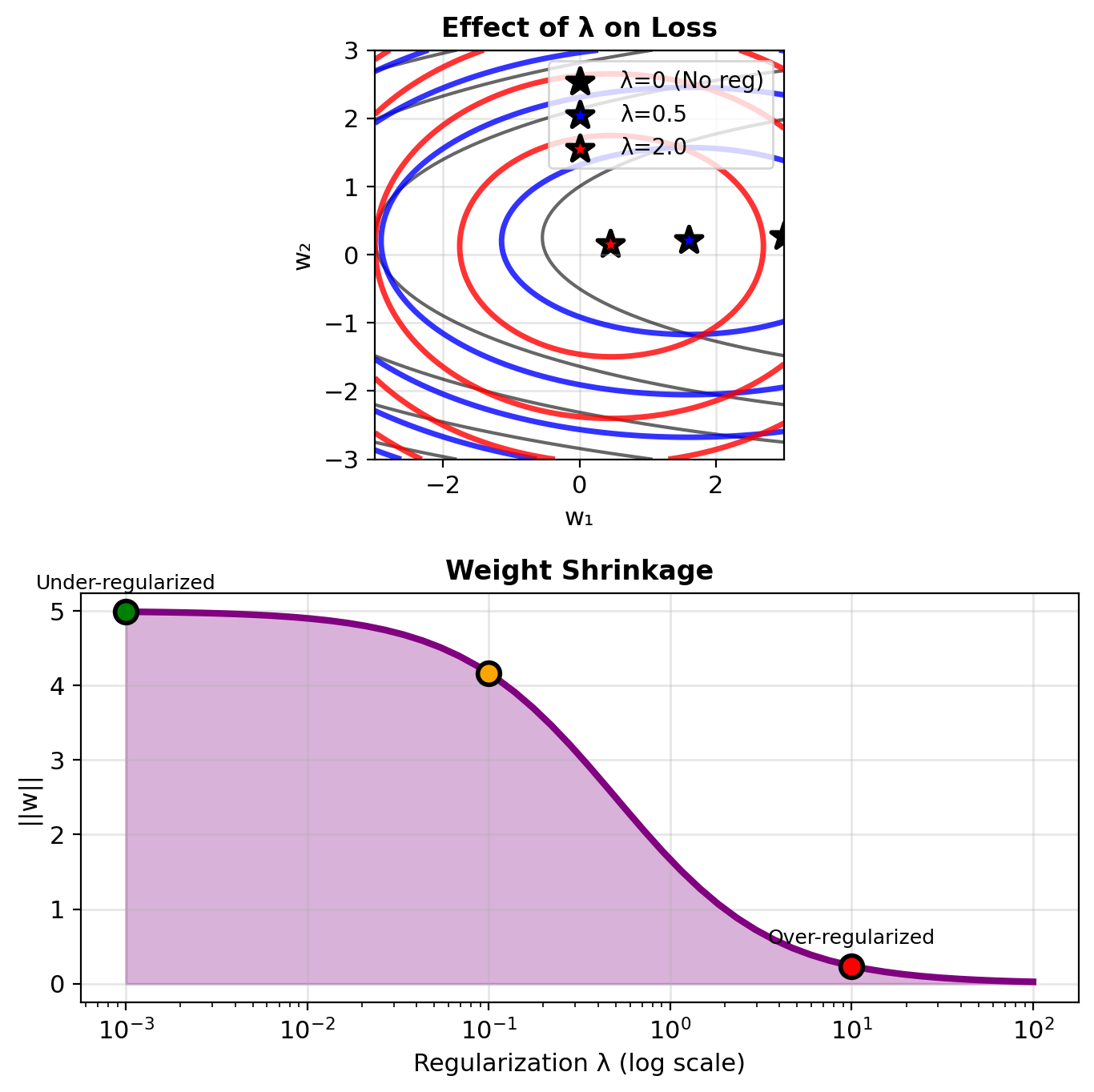 Larger λ → Smaller weights → More stable model