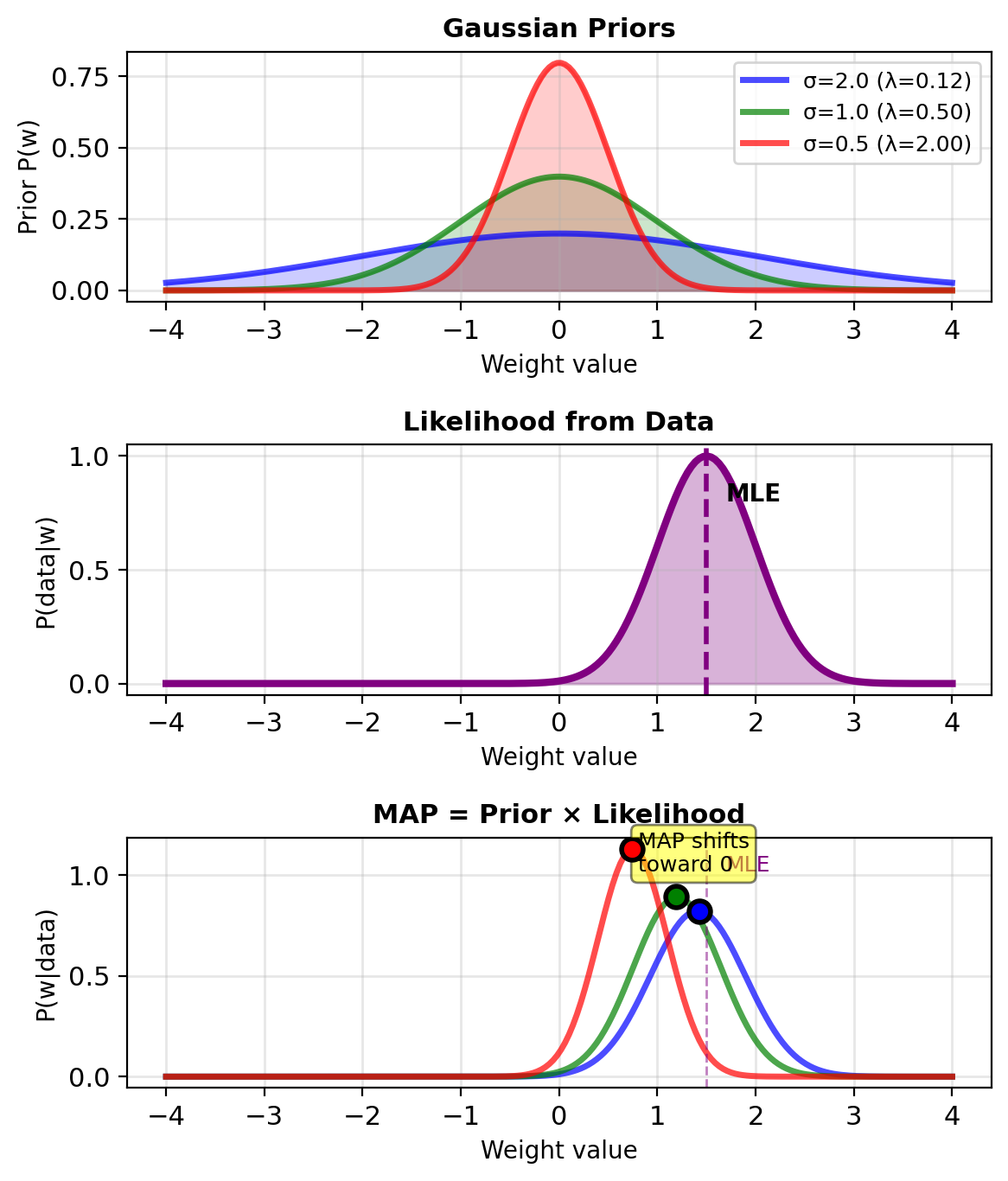 Prior on weights: \[P(\mathbf{w}) = \mathcal{N}(\mathbf{0}, \sigma^2\mathbf{I})\] \[\propto \exp\left(-\frac{||\mathbf{w}||^2}{2\sigma^2}\right)\]