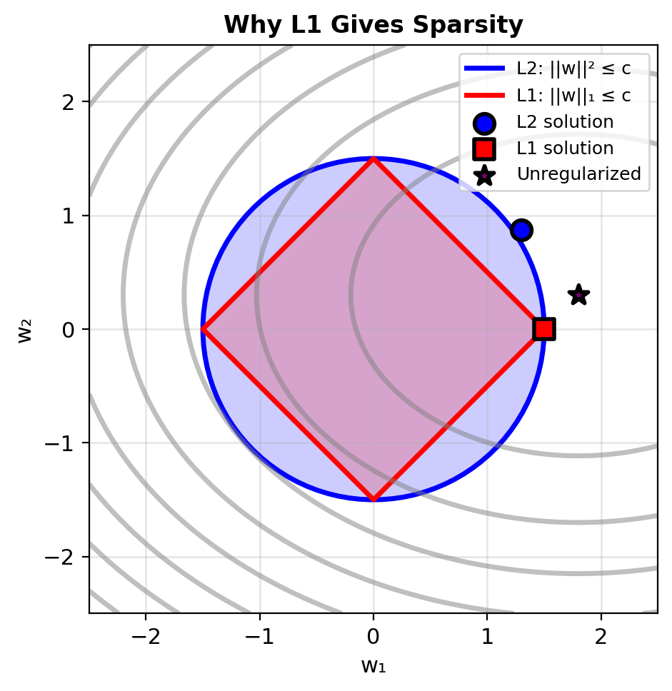 L1 hits corners → Some weights exactly 0