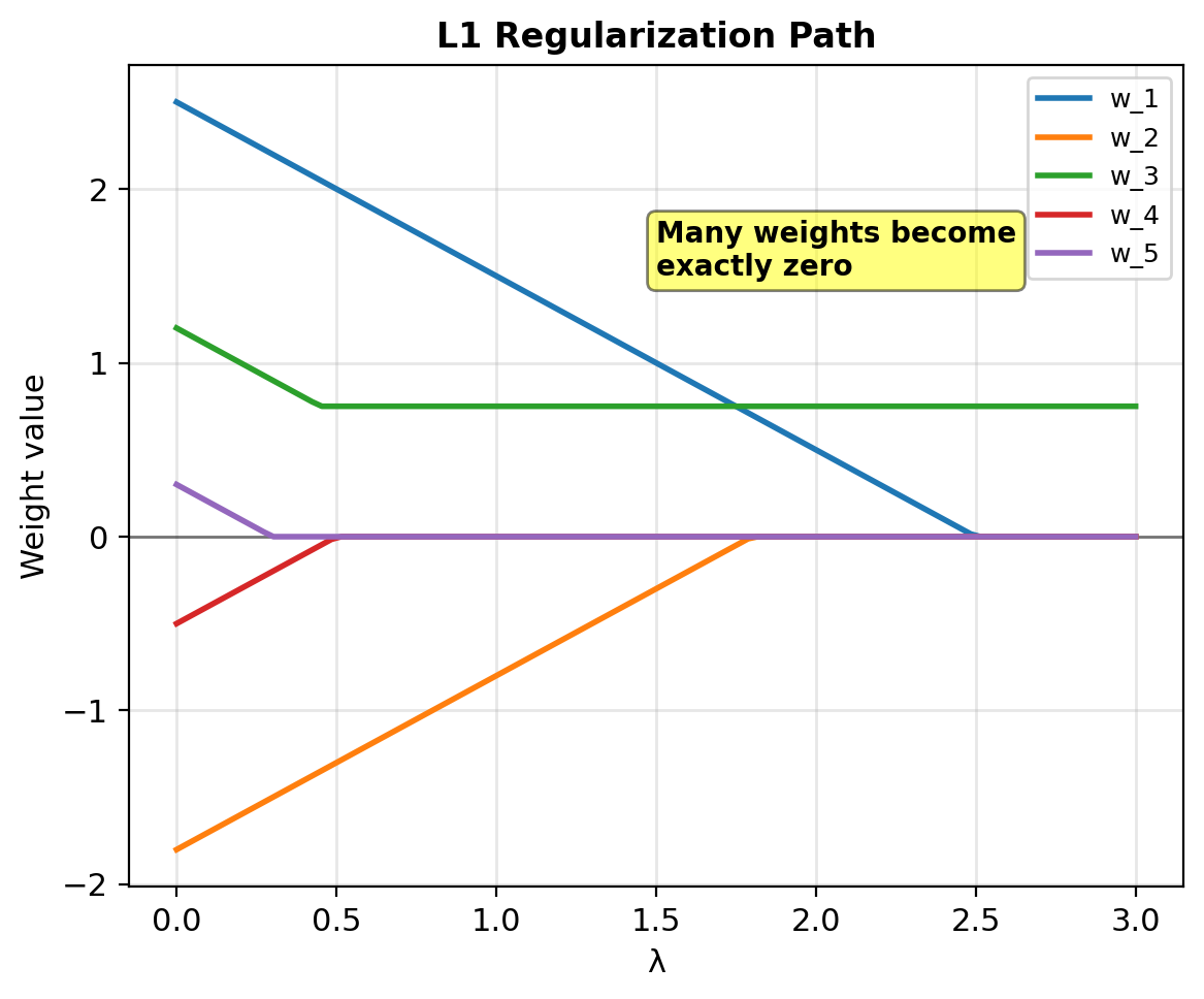 Induces exact sparsity: Many weights become exactly zero