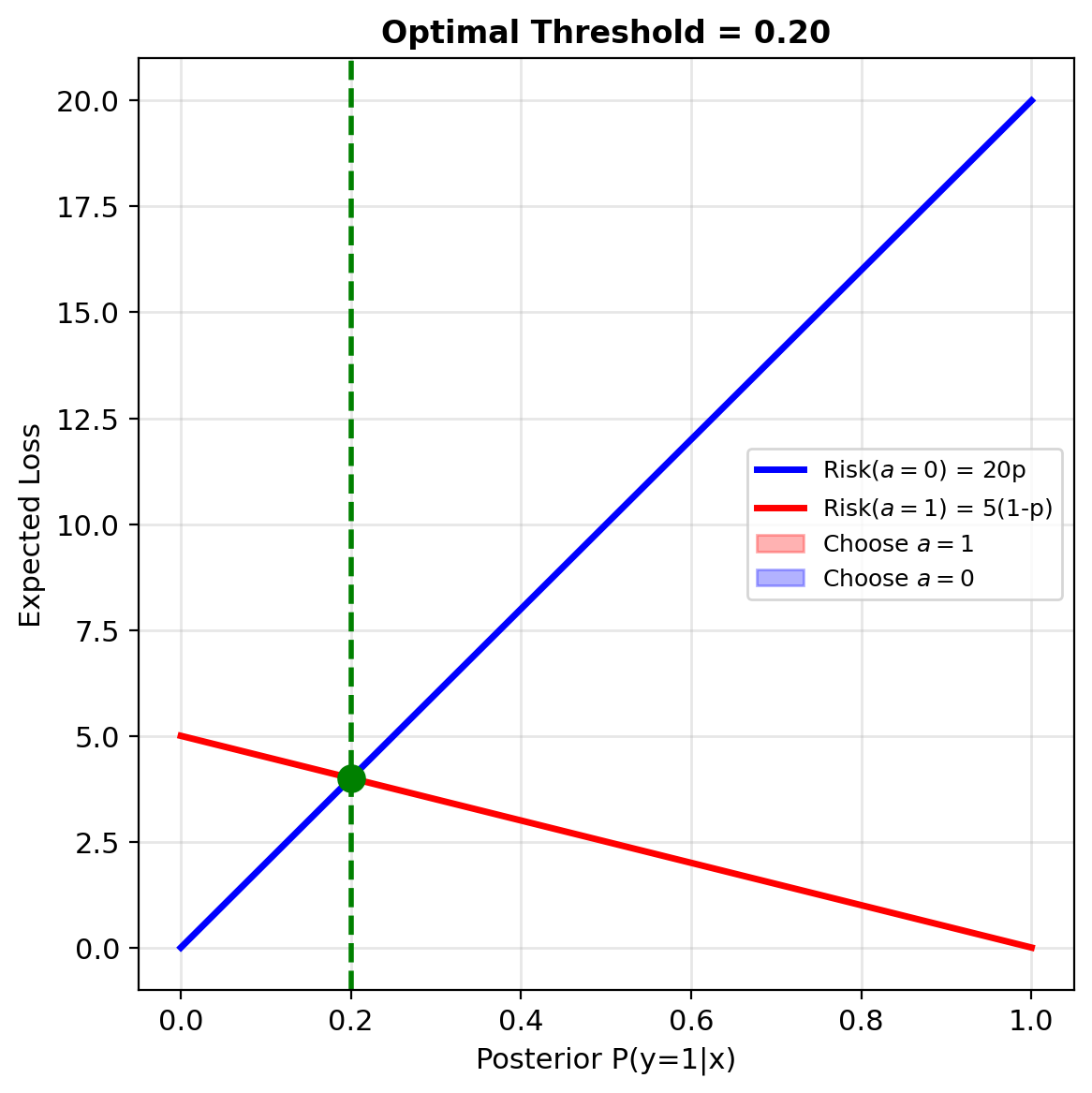 Optimal decision: \[\hat{y}^* = \arg\min_a R_a(\mathbf{x})\]