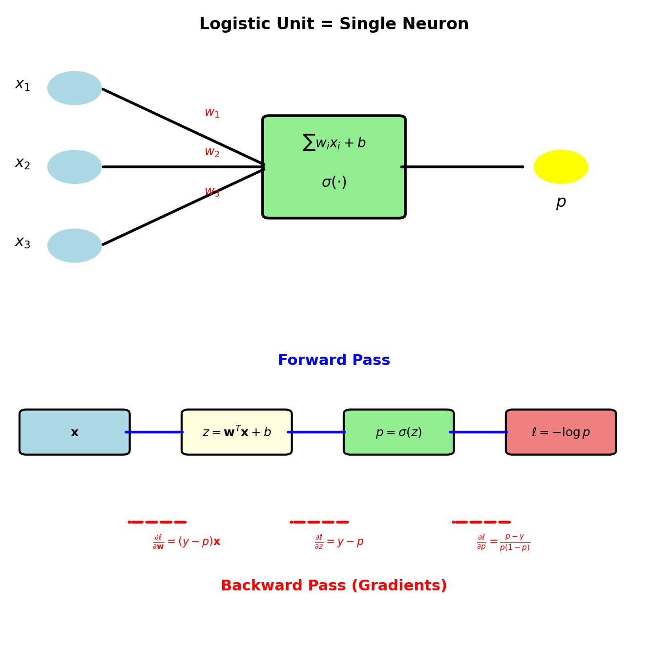 Forward pass: \[\mathbf{x} \to \mathbf{w}^T\mathbf{x} + b \to \sigma(\cdot) \to p\]