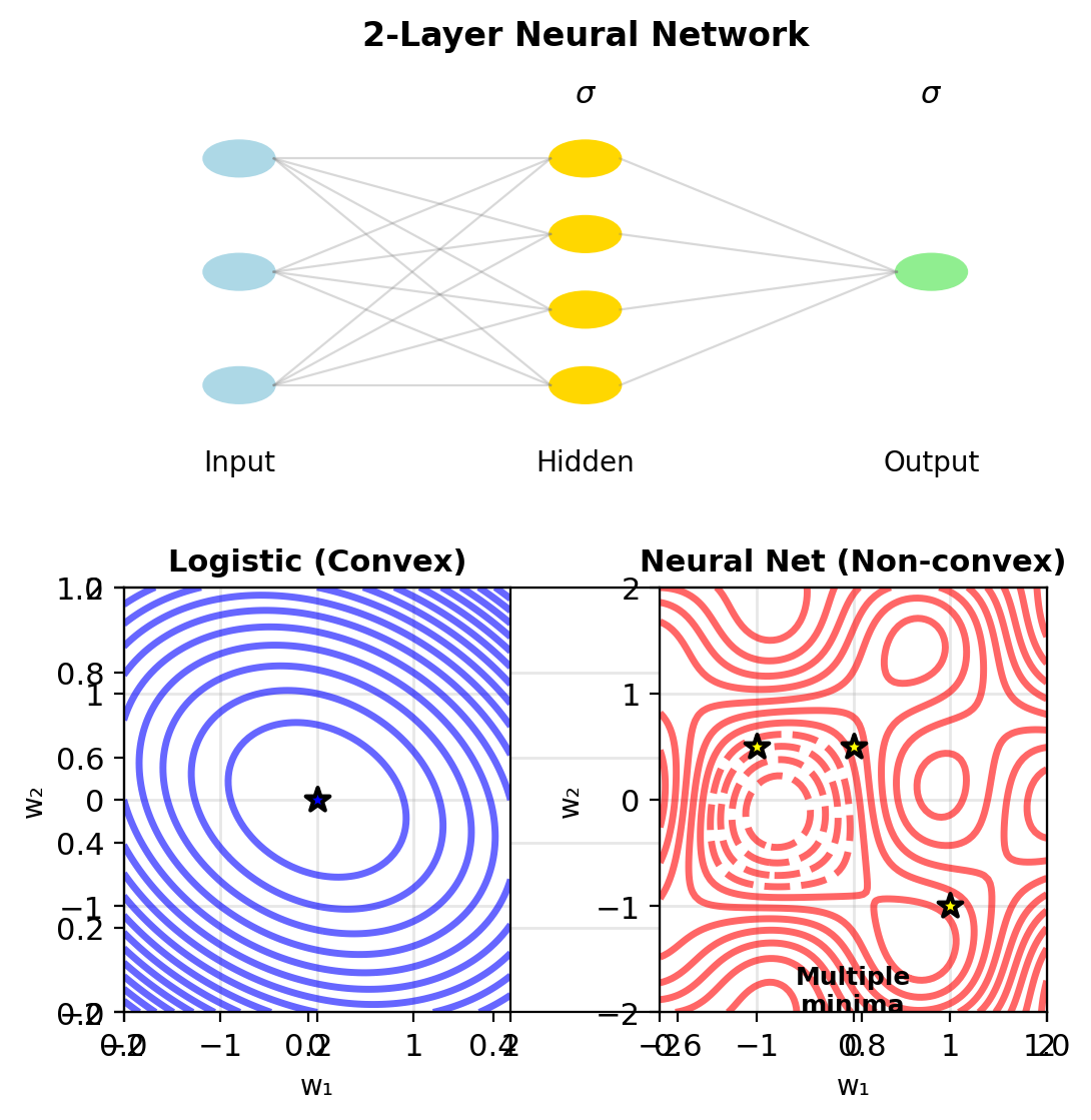 Same cross-entropy loss: \[\min_{\mathbf{W}_1, \mathbf{W}_2} -\sum_{i=1}^n [y_i \log p_i + (1-y_i)\log(1-p_i)]\]