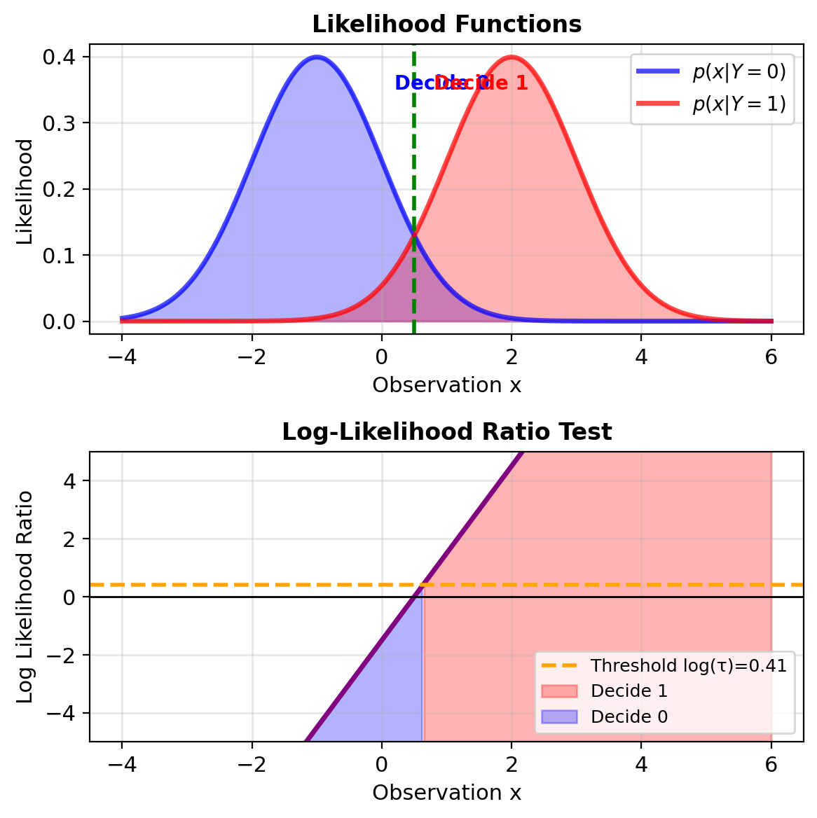Likelihood Ratio Test: \[\boxed{\Lambda(\mathbf{x}) = \frac{p(\mathbf{x}|Y=1)}{p(\mathbf{x}|Y=0)} \underset{H_0}{\overset{H_1}{\gtrless}} \tau}\]