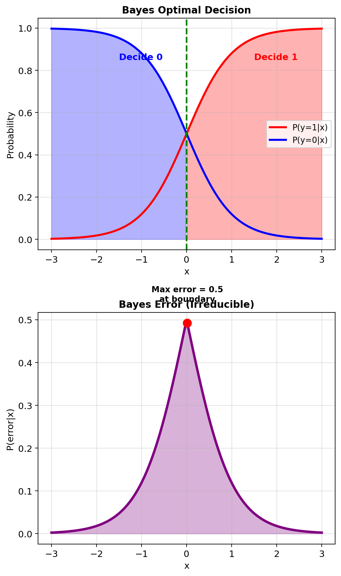 Bayes optimal decision: \[\hat{y}^* = \arg\max_k P(Y=k|\mathbf{x})\]